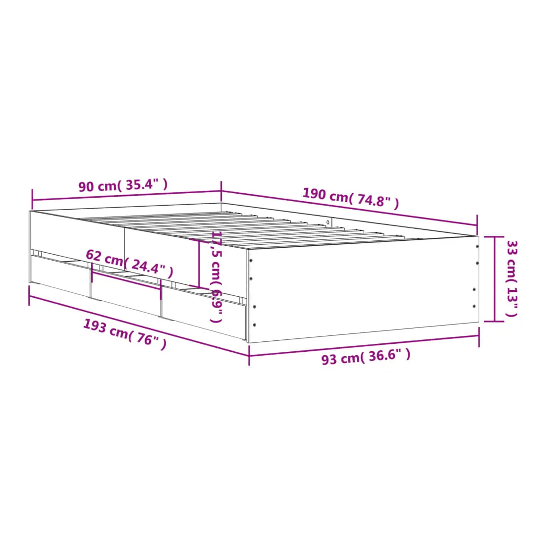 - Dimensions totales : 193 x 93 x 33 cm (L x l x H)