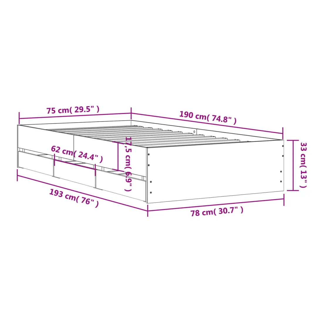 - Dimensions du matelas correspondant : 75 x 190 cm (l x L) (matelas est non inclus)