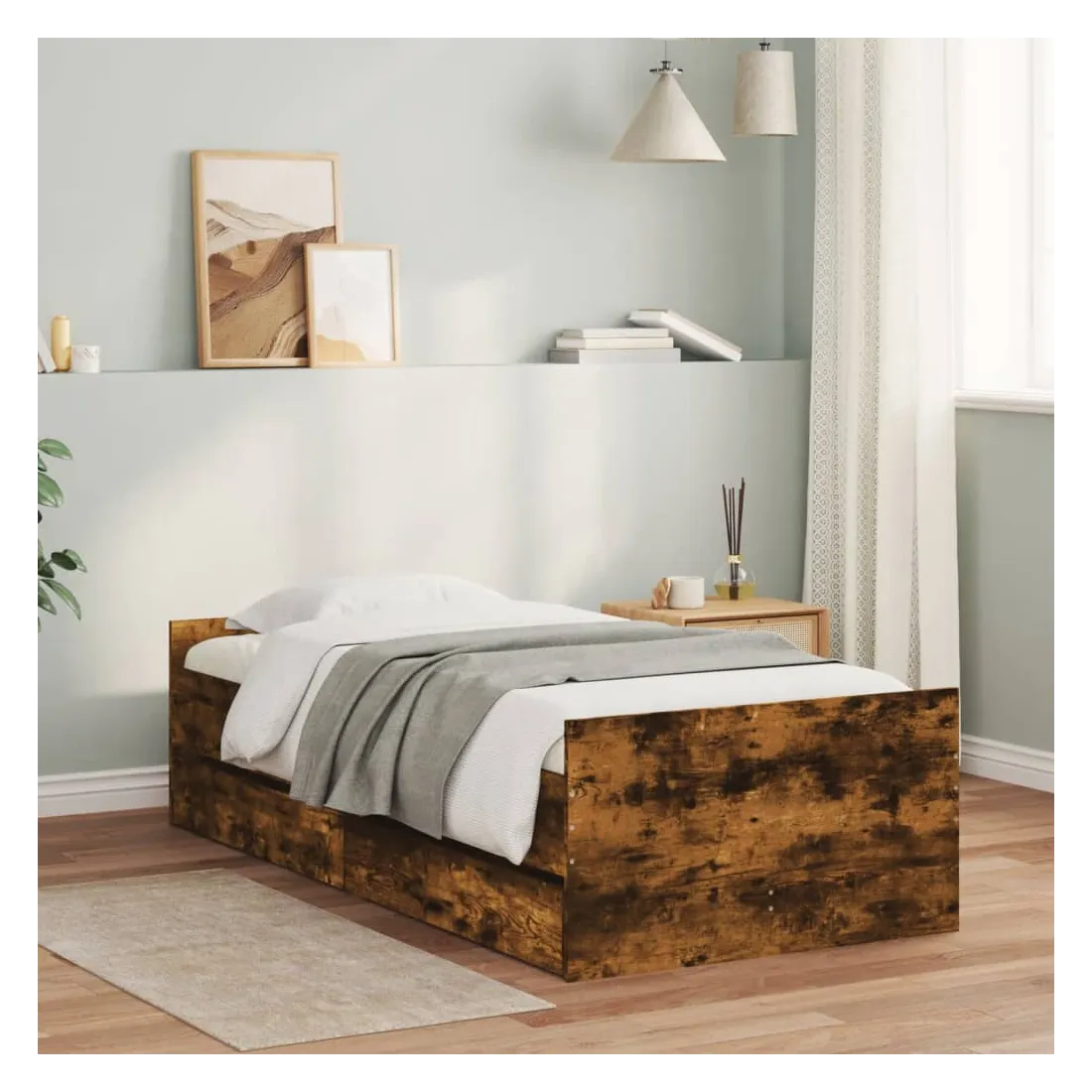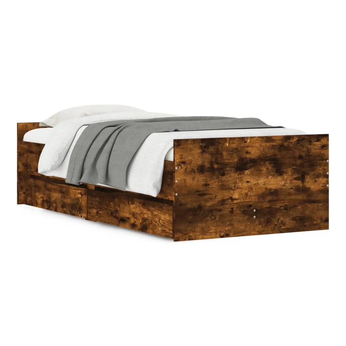 Ajoutez une touche moderne à votre chambre à coucher avec ce cadre de lit avec tiroirs ! Il apportera une touche pratique et décorative à votre espace de vie. Matériau durable : le cadre de lit est fabriquée en bois d'ingénierie. Le bois d'ingénierie est d'une qualité exceptionnelle avec une surface lisse et présente également de la résistance, de la stabilité et de la résistance à l'humidité.Lattes robustes : les lattes de contreplaqué assurent une bonne répartition du poids, garantissant que le matelas reste en place à chaque torsion de votre corps pendant le sommeil.Fonction de rangement : les tiroirs de lit inclus offrent suffisamment d'espace de rangement pour ranger vos articles essentiels, gardant votre pièce propre et bien rangée. Bon à savoir :Un matelas n'est pas inclus avec ce lit. Nous offrons une sélection variée de matelas. Vous pouvez consulter notre boutique pour trouver un matelas assorti.