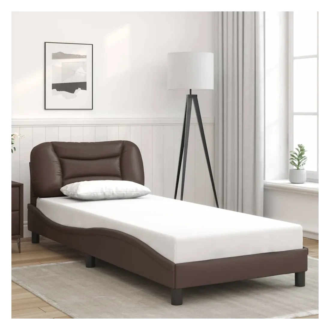 Obtenez une meilleure nuit de sommeil reposante grâce à ce cadre de lit avec tête de lit ! Il est un supplément accueillant à toute chambre à coucher. Similicuir durable : le similicuir de qualité supérieure est un matériau très durable. Il est résistant aux taches, ce qui le rend facile à nettoyer avec un chiffon humide. La surface lisse donne également un aspect luxueux et la beauté du cuir véritable.Lattes de contreplaqué : les lattes de contreplaqué assurent une bonne répartition du poids, garantissant que le matelas reste en place à chaque torsion de votre corps pendant le sommeil.Excellent soutien : l'oreiller de tête de lit est rembourré avec de la fibre de polypropylène pour un confort ultra doux et optimal vous offre un excellent soutien du dos lorsque vous êtes assis dans votre lit pour lire ou regarder la télévision.Design latéral ondulé : l’aspect ondulé du cadre de lit est élégant et sophistiqué, ajoutant une touche moderne et élégante à votre décor, ce qui en fait le point central de votre chambre à coucher. Bon à savoir :Un matelas n'est pas inclus avec ce lit. Nous offrons une sélection variée de matelas. Vous pouvez consulter notre boutique pour trouver un matelas assorti.