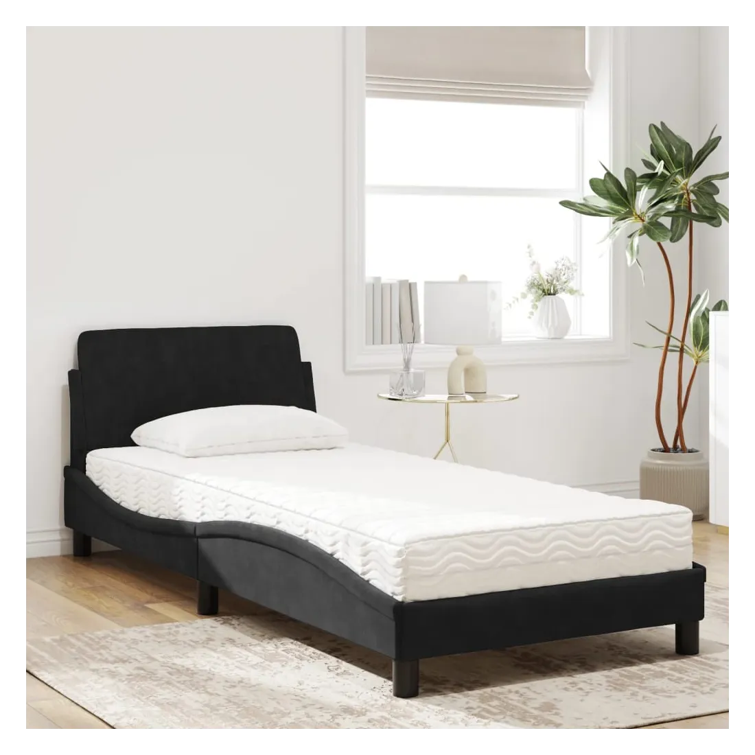 Obtenez une meilleure nuit de sommeil reposante grâce à ce lit avec matelas ! Il est un supplément accueillant à toute chambre à coucher. Velours doux : le velours est un tissu doux et confortable, agréable au toucher.Lattes de contreplaqué : les lattes de contreplaqué assurent une bonne répartition du poids, garantissant que le matelas reste en place à chaque torsion de votre corps pendant le sommeil.Excellent soutien : la tête de lit vous offre un excellent soutien du dos lorsque vous êtes assis dans votre lit pour lire ou regarder la télévision.Matelas en mousse : ce matelas de lit en tissu à 3 couches est rempli de mousse PU 22D pour un confort optimal. Il contribue à soulager la fatigue et à favoriser la circulation sanguine, vous offrant ainsi une relaxation complète et une bonne qualité de sommeil. En outre, le matelas est disponible en dureté H2 et H3, de sorte que vous pouvez simplement tourner le matelas pour choisir la dureté qui vous convient le mieux.Design latéral ondulé : l’aspect ondulé du cadre de lit est élégant et sophistiqué, ajoutant une touche moderne et élégante à votre décor, ce qui en fait le point central de votre chambre à coucher.