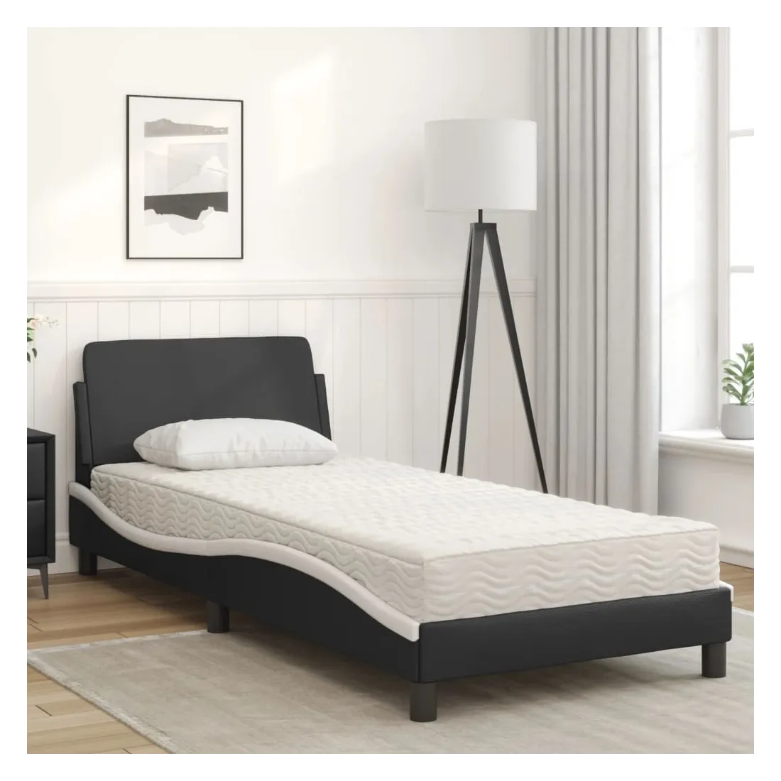 Obtenez une meilleure nuit de sommeil reposante grâce à ce lit avec matelas ! Il est un supplément accueillant à toute chambre à coucher. Similicuir durable : le similicuir de qualité supérieure est un matériau très durable. Il est résistant aux taches, ce qui le rend facile à nettoyer avec un chiffon humide. La surface lisse donne également un aspect luxueux et la beauté du cuir véritable.Lattes de contreplaqué : les lattes de contreplaqué assurent une bonne répartition du poids, garantissant que le matelas reste en place à chaque torsion de votre corps pendant le sommeil.Excellent soutien : la tête de lit vous offre un excellent soutien du dos lorsque vous êtes assis dans votre lit pour lire ou regarder la télévision.Matelas en mousse : ce matelas de lit en tissu à 3 couches est rempli de mousse PU 22D pour un confort optimal. Il contribue à soulager la fatigue et à favoriser la circulation sanguine, vous offrant ainsi une relaxation complète et une bonne qualité de sommeil. En outre, le matelas est disponible en dureté H2 et H3, de sorte que vous pouvez simplement tourner le matelas pour choisir la dureté qui vous convient le mieux.Design latéral ondulé : l’aspect ondulé du cadre de lit est élégant et sophistiqué, ajoutant une touche moderne et élégante à votre décor, ce qui en fait le point central de votre chambre à coucher.