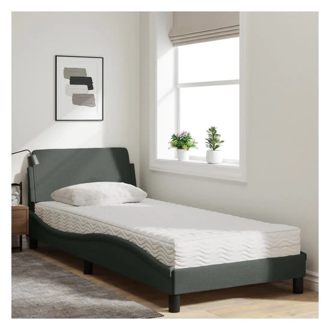 Obtenez une meilleure nuit de sommeil reposante grâce à ce lit avec matelas ! Il est un supplément accueillant à toute chambre à coucher. Tissu durable : le tissu présente un aspect simple et épuré, et il est respirant et durable.Lattes de contreplaqué : les lattes de contreplaqué assurent une bonne répartition du poids, garantissant que le matelas reste en place à chaque torsion de votre corps pendant le sommeil.Excellent soutien : la tête de lit vous offre un excellent soutien du dos lorsque vous êtes assis dans votre lit pour lire ou regarder la télévision.Matelas en mousse : ce matelas de lit en tissu à 3 couches est rempli de mousse PU 22D pour un confort optimal. Il contribue à soulager la fatigue et à favoriser la circulation sanguine, vous offrant ainsi une relaxation complète et une bonne qualité de sommeil. En outre, le matelas est disponible en dureté H2 et H3, de sorte que vous pouvez simplement tourner le matelas pour choisir la dureté qui vous convient le mieux.Design latéral ondulé : l’aspect ondulé du cadre de lit est élégant et sophistiqué, ajoutant une touche moderne et élégante à votre décor, ce qui en fait le point central de votre chambre à coucher.