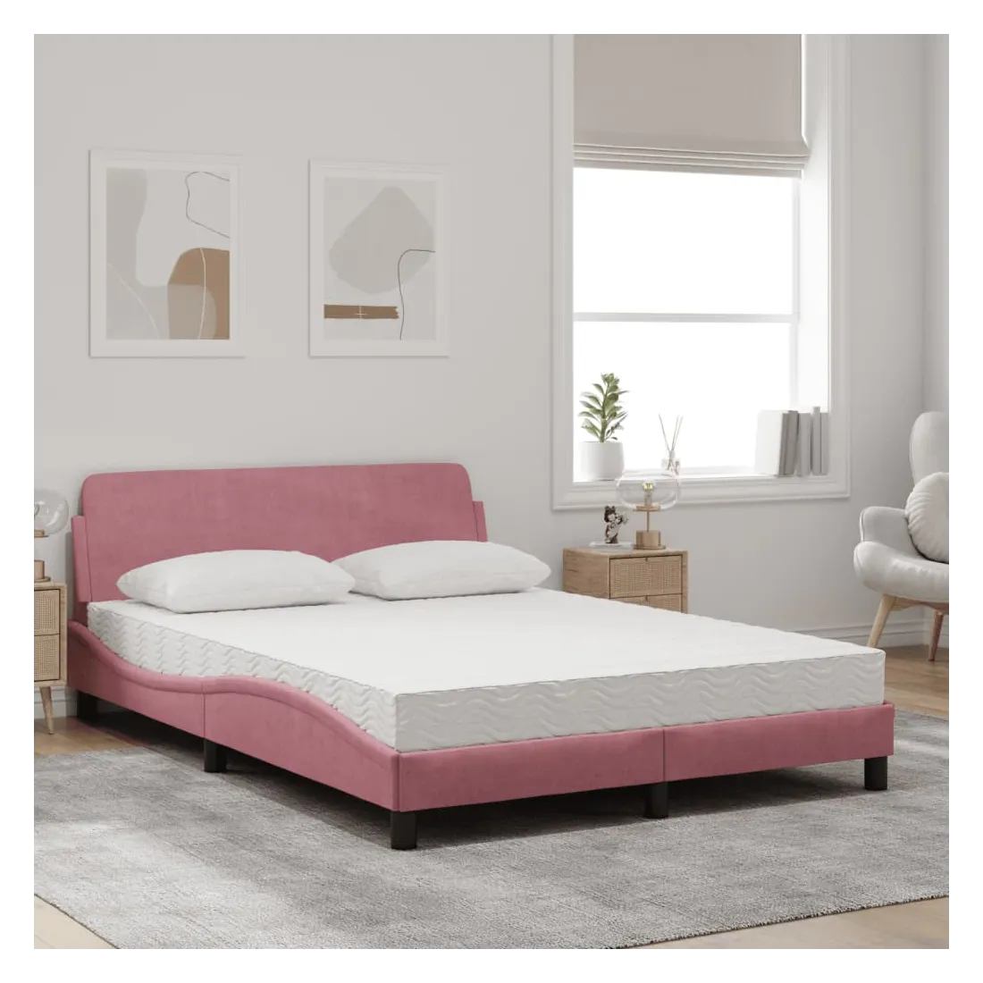 Obtenez une meilleure nuit de sommeil reposante grâce à ce lit avec matelas ! Il est un supplément accueillant à toute chambre à coucher. Velours doux : le velours est un tissu doux et confortable, agréable au toucher.Lattes de contreplaqué : les lattes de contreplaqué assurent une bonne répartition du poids, garantissant que le matelas reste en place à chaque torsion de votre corps pendant le sommeil.Excellent soutien : la tête de lit vous offre un excellent soutien du dos lorsque vous êtes assis dans votre lit pour lire ou regarder la télévision.Matelas en mousse : ce matelas de lit en tissu à 3 couches est rempli de mousse PU 22D pour un confort optimal. Il contribue à soulager la fatigue et à favoriser la circulation sanguine, vous offrant ainsi une relaxation complète et une bonne qualité de sommeil. En outre, le matelas est disponible en dureté H2 et H3, de sorte que vous pouvez simplement tourner le matelas pour choisir la dureté qui vous convient le mieux.Design latéral ondulé : l’aspect ondulé du cadre de lit est élégant et sophistiqué, ajoutant une touche moderne et élégante à votre décor, ce qui en fait le point central de votre chambre à coucher.