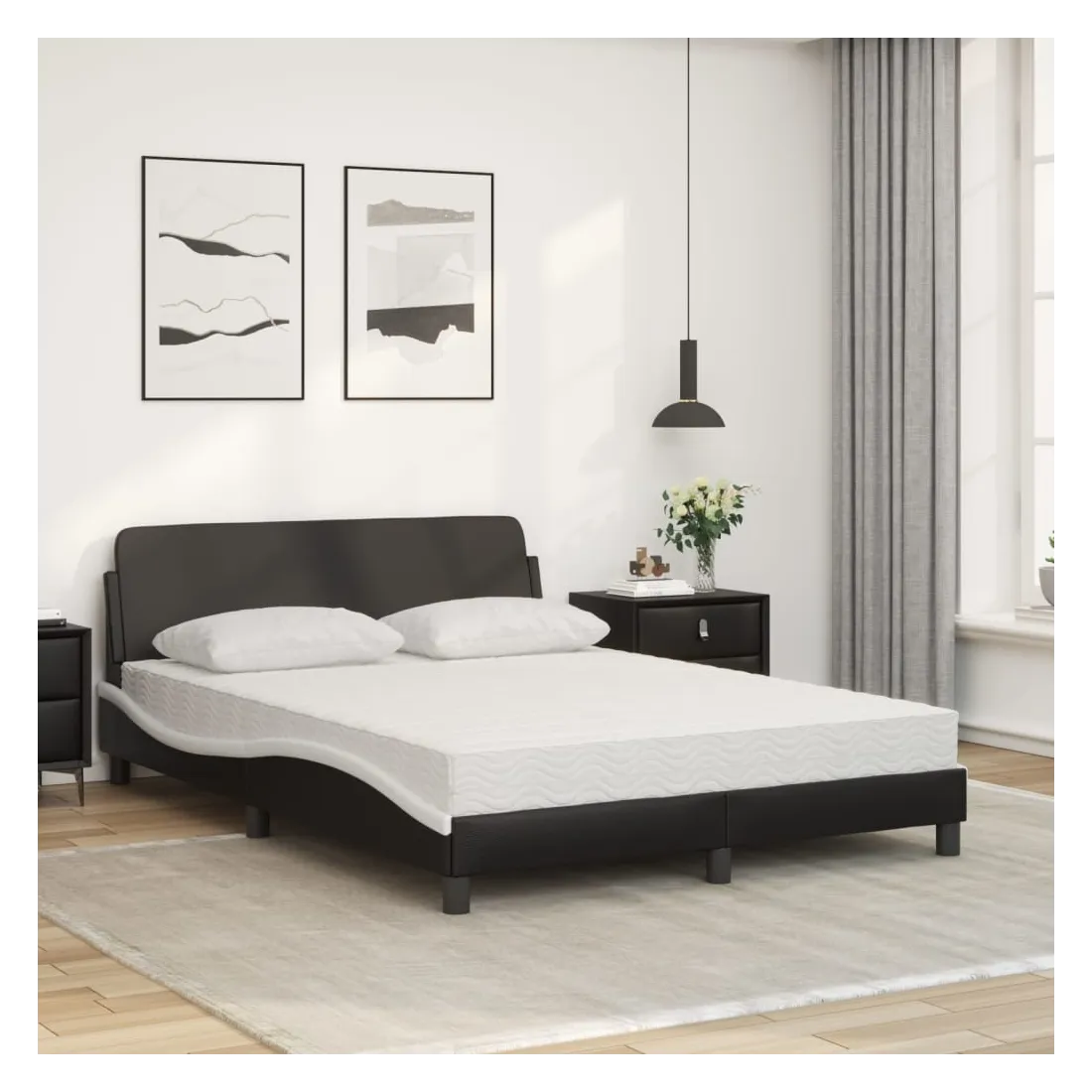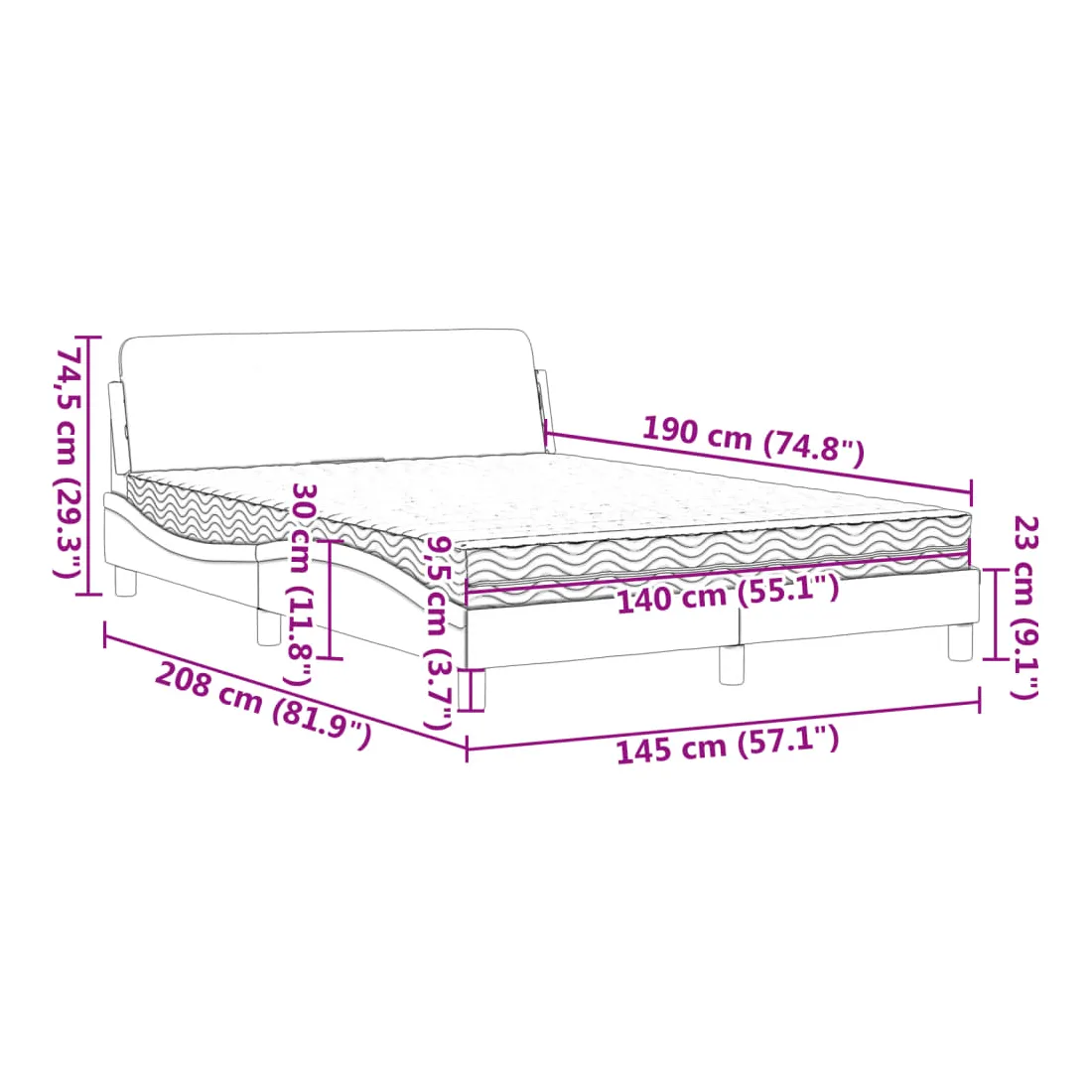 Obtenez une meilleure nuit de sommeil reposante grâce à ce lit avec matelas ! Il est un supplément accueillant à toute chambre à coucher. Similicuir durable : le similicuir de qualité supérieure est un matériau très durable. Il est résistant aux taches, ce qui le rend facile à nettoyer avec un chiffon humide. La surface lisse donne également un aspect luxueux et la beauté du cuir véritable.Lattes de contreplaqué : les lattes de contreplaqué assurent une bonne répartition du poids, garantissant que le matelas reste en place à chaque torsion de votre corps pendant le sommeil.Excellent soutien : la tête de lit vous offre un excellent soutien du dos lorsque vous êtes assis dans votre lit pour lire ou regarder la télévision.Matelas en mousse : ce matelas de lit en tissu à 3 couches est rempli de mousse PU 22D pour un confort optimal. Il contribue à soulager la fatigue et à favoriser la circulation sanguine, vous offrant ainsi une relaxation complète et une bonne qualité de sommeil. En outre, le matelas est disponible en dureté H2 et H3, de sorte que vous pouvez simplement tourner le matelas pour choisir la dureté qui vous convient le mieux.Design latéral ondulé : l’aspect ondulé du cadre de lit est élégant et sophistiqué, ajoutant une touche moderne et élégante à votre décor, ce qui en fait le point central de votre chambre à coucher.