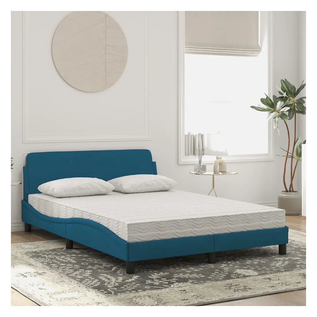 Obtenez une meilleure nuit de sommeil reposante grâce à ce lit avec matelas ! Il est un supplément accueillant à toute chambre à coucher. Velours doux : le velours est un tissu doux et confortable, agréable au toucher.Lattes de contreplaqué : les lattes de contreplaqué assurent une bonne répartition du poids, garantissant que le matelas reste en place à chaque torsion de votre corps pendant le sommeil.Excellent soutien : la tête de lit vous offre un excellent soutien du dos lorsque vous êtes assis dans votre lit pour lire ou regarder la télévision.Matelas en mousse : ce matelas de lit en tissu à 3 couches est rempli de mousse PU 22D pour un confort optimal. Il contribue à soulager la fatigue et à favoriser la circulation sanguine, vous offrant ainsi une relaxation complète et une bonne qualité de sommeil. En outre, le matelas est disponible en dureté H2 et H3, de sorte que vous pouvez simplement tourner le matelas pour choisir la dureté qui vous convient le mieux.Design latéral ondulé : l’aspect ondulé du cadre de lit est élégant et sophistiqué, ajoutant une touche moderne et élégante à votre décor, ce qui en fait le point central de votre chambre à coucher.