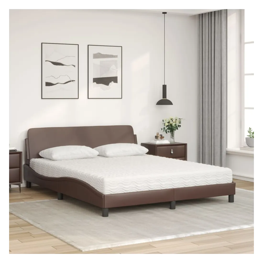 Obtenez une meilleure nuit de sommeil reposante grâce à ce lit avec matelas ! Il est un supplément accueillant à toute chambre à coucher. Similicuir durable : le similicuir de qualité supérieure est un matériau très durable. Il est résistant aux taches, ce qui le rend facile à nettoyer avec un chiffon humide. La surface lisse donne également un aspect luxueux et la beauté du cuir véritable.Lattes de contreplaqué : les lattes de contreplaqué assurent une bonne répartition du poids, garantissant que le matelas reste en place à chaque torsion de votre corps pendant le sommeil.Excellent soutien : la tête de lit vous offre un excellent soutien du dos lorsque vous êtes assis dans votre lit pour lire ou regarder la télévision.Matelas en mousse : ce matelas de lit en tissu à 3 couches est rempli de mousse PU 22D pour un confort optimal. Il contribue à soulager la fatigue et à favoriser la circulation sanguine, vous offrant ainsi une relaxation complète et une bonne qualité de sommeil. En outre, le matelas est disponible en dureté H2 et H3, de sorte que vous pouvez simplement tourner le matelas pour choisir la dureté qui vous convient le mieux.Design latéral ondulé : l’aspect ondulé du cadre de lit est élégant et sophistiqué, ajoutant une touche moderne et élégante à votre décor, ce qui en fait le point central de votre chambre à coucher.