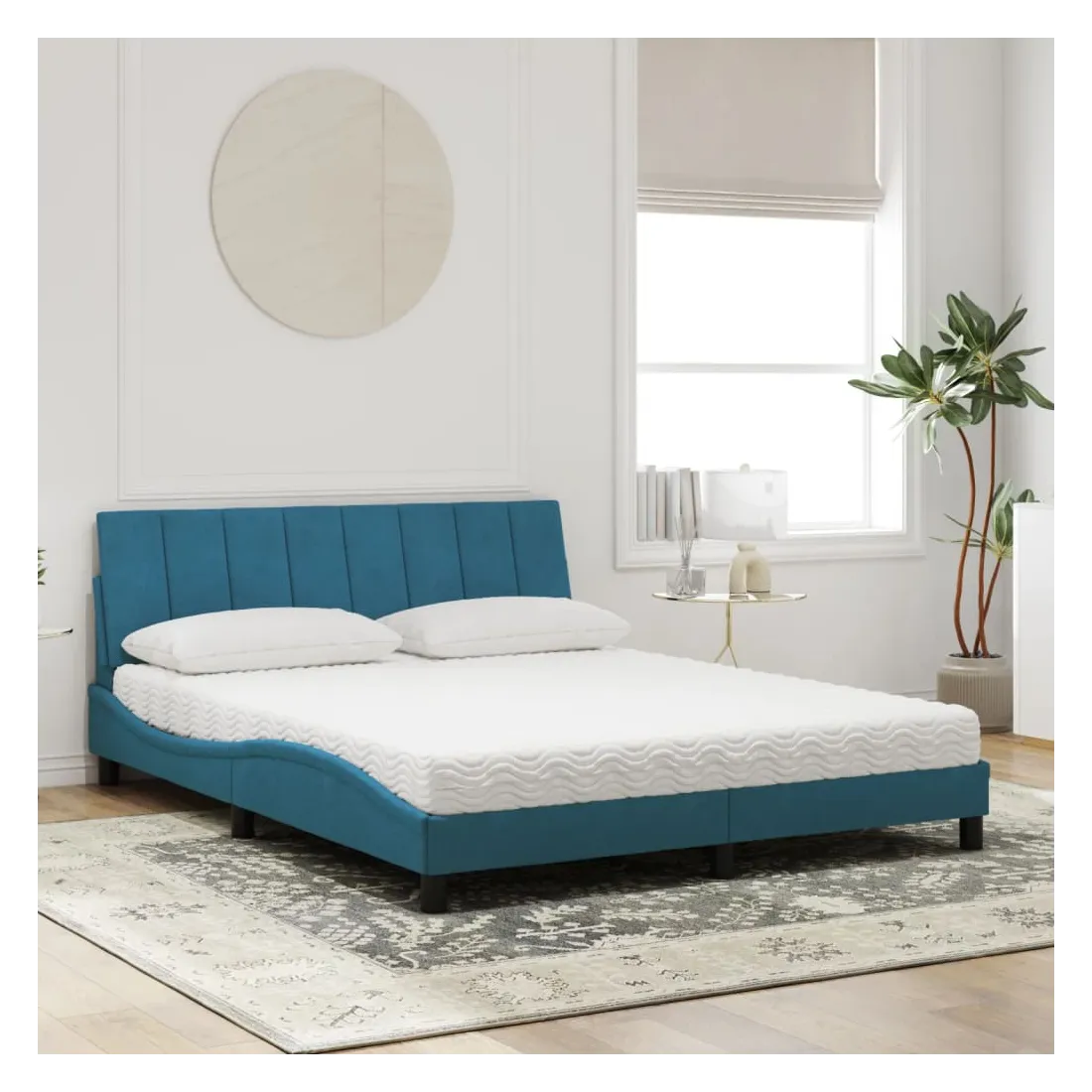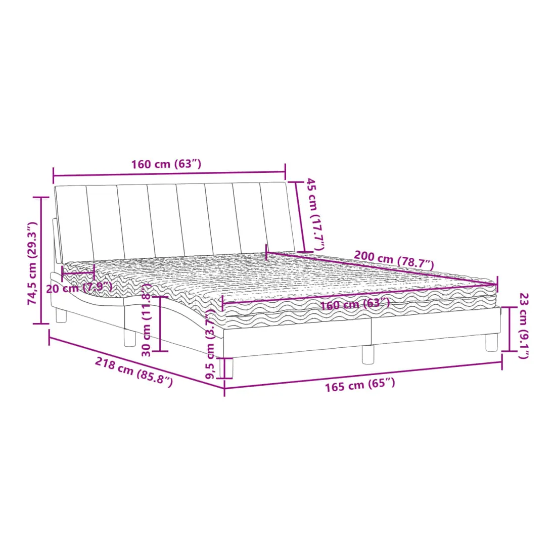Obtenez une meilleure nuit de sommeil reposante grâce à ce lit avec matelas ! Il est un supplément accueillant à toute chambre à coucher. Velours doux : le velours est un tissu doux et confortable, agréable au toucher.Lattes de contreplaqué : les lattes de contreplaqué assurent une bonne répartition du poids, garantissant que le matelas reste en place à chaque torsion de votre corps pendant le sommeil.Excellent soutien : la tête de lit vous offre un excellent soutien du dos lorsque vous êtes assis dans votre lit pour lire ou regarder la télévision.Matelas en mousse : ce matelas de lit en tissu à 3 couches est rempli de mousse PU 22D pour un confort optimal. Il contribue à soulager la fatigue et à favoriser la circulation sanguine, vous offrant ainsi une relaxation complète et une bonne qualité de sommeil. En outre, le matelas est disponible en dureté H2 et H3, de sorte que vous pouvez simplement tourner le matelas pour choisir la dureté qui vous convient le mieux.Design latéral ondulé : l’aspect ondulé du cadre de lit est élégant et sophistiqué, ajoutant une touche moderne et élégante à votre décor, ce qui en fait le point central de votre chambre à coucher.