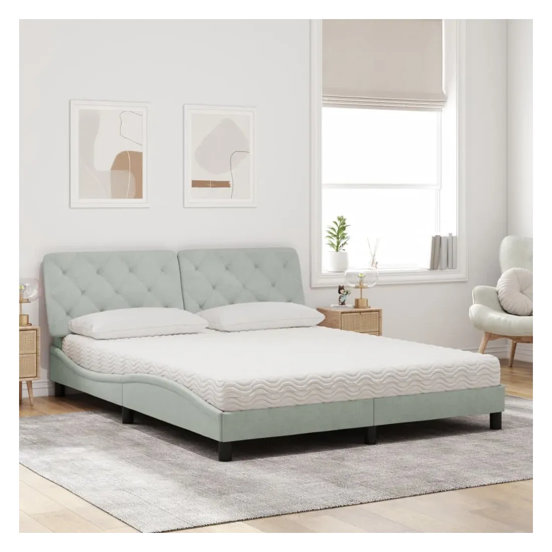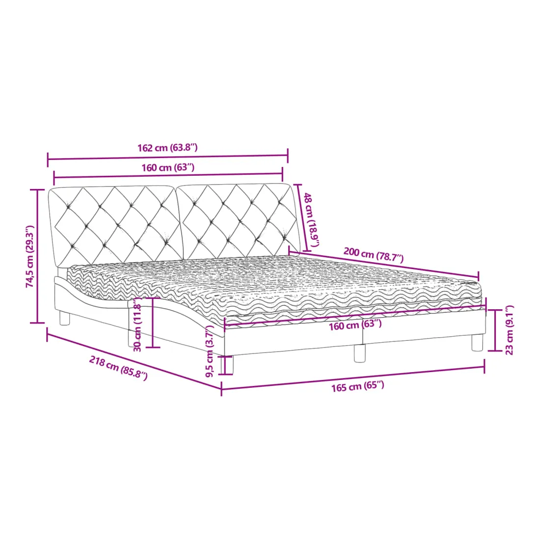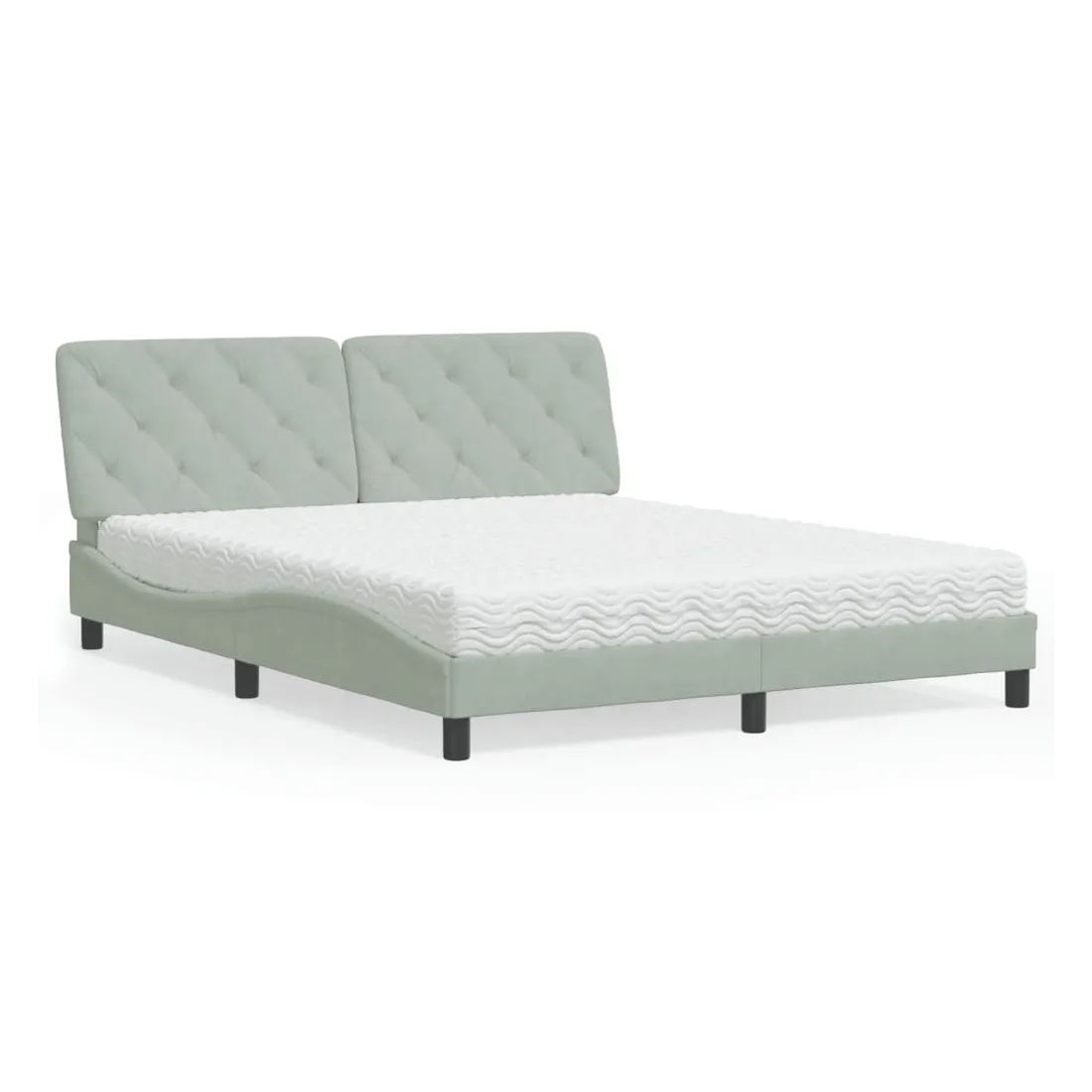 Obtenez une meilleure nuit de sommeil reposante grâce à ce lit avec matelas ! Il est un supplément accueillant à toute chambre à coucher. Velours doux : le velours est un tissu doux et confortable, agréable au toucher.Lattes de contreplaqué : les lattes de contreplaqué assurent une bonne répartition du poids, garantissant que le matelas reste en place à chaque torsion de votre corps pendant le sommeil.Excellent soutien : la tête de lit vous offre un excellent soutien du dos lorsque vous êtes assis dans votre lit pour lire ou regarder la télévision.Matelas en mousse : ce matelas de lit en tissu à 3 couches est rempli de mousse PU 22D pour un confort optimal. Il contribue à soulager la fatigue et à favoriser la circulation sanguine, vous offrant ainsi une relaxation complète et une bonne qualité de sommeil. En outre, le matelas est disponible en dureté H2 et H3, de sorte que vous pouvez simplement tourner le matelas pour choisir la dureté qui vous convient le mieux.Design latéral ondulé : l’aspect ondulé du cadre de lit est élégant et sophistiqué, ajoutant une touche moderne et élégante à votre décor, ce qui en fait le point central de votre chambre à coucher.