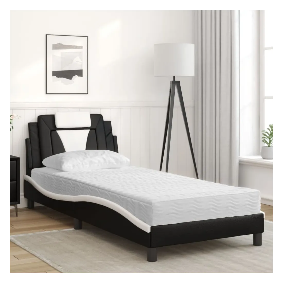 Obtenez une meilleure nuit de sommeil reposante grâce à ce lit avec matelas ! Il est un supplément accueillant à toute chambre à coucher. Similicuir durable : le similicuir de qualité supérieure est un matériau très durable. Il est résistant aux taches, ce qui le rend facile à nettoyer avec un chiffon humide. La surface lisse donne également un aspect luxueux et la beauté du cuir véritable. Lattes de contreplaqué : les lattes de contreplaqué assurent une bonne répartition du poids, garantissant que le matelas reste en place à chaque torsion de votre corps pendant le sommeil. Excellent soutien : l'oreiller de tête de lit est rembourré avec de la mousse pour un confort ultra doux et optimal vous offre un excellent soutien du dos lorsque vous êtes assis dans votre lit pour lire ou regarder la télévision. Matelas en mousse : ce matelas de lit en tissu à 3 couches est rempli de mousse PU 22D pour un confort optimal. Il contribue à soulager la fatigue et à favoriser la circulation sanguine, vous offrant ainsi une relaxation complète et une bonne qualité de sommeil. En outre, le matelas est disponible en dureté H2 et H3, de sorte que vous pouvez simplement tourner le matelas pour choisir la dureté qui vous convient le mieux. Design latéral ondulé : l’aspect ondulé du cadre de lit est élégant et sophistiqué, ajoutant une touche moderne et élégante à votre décor, ce qui en fait le point central de votre chambre à coucher.