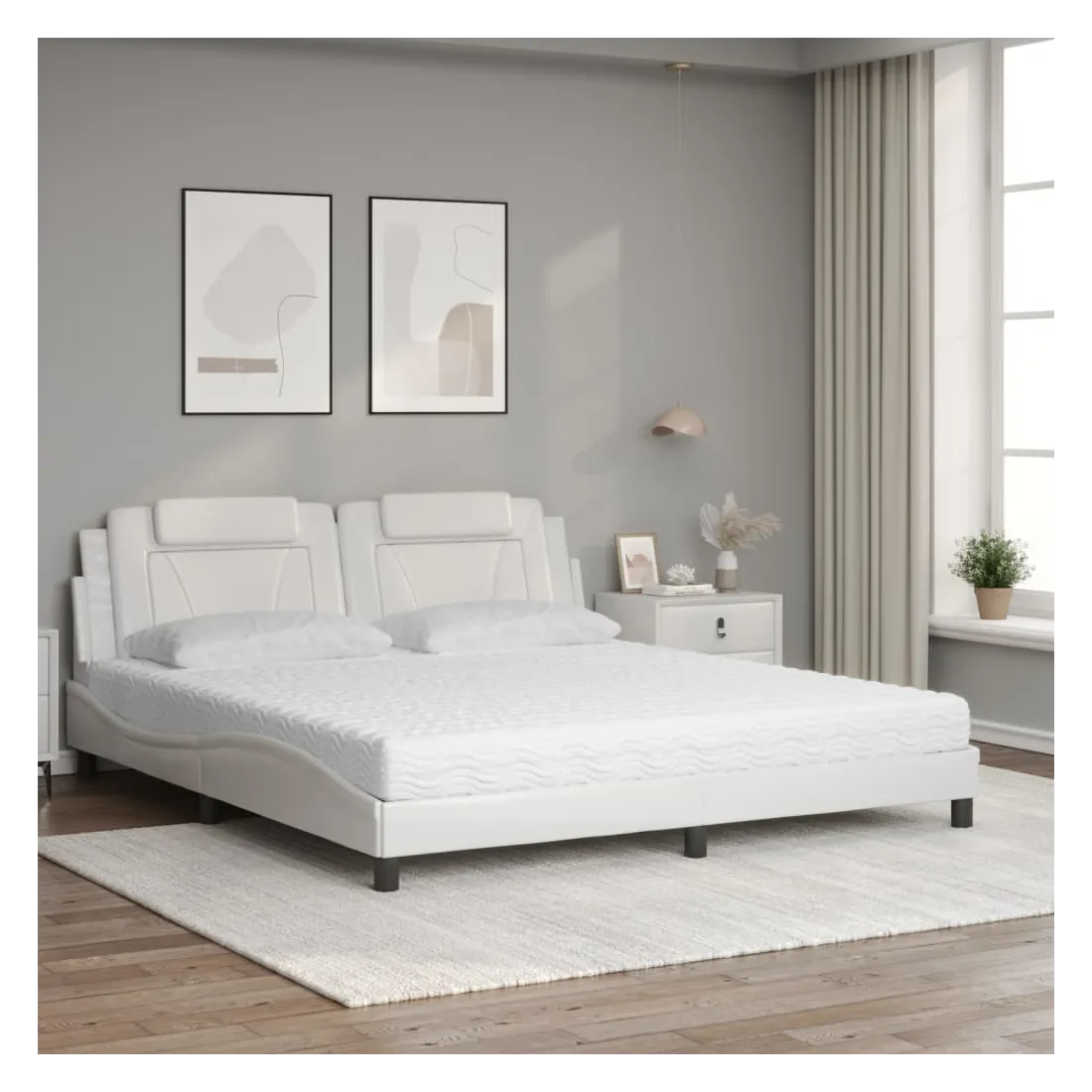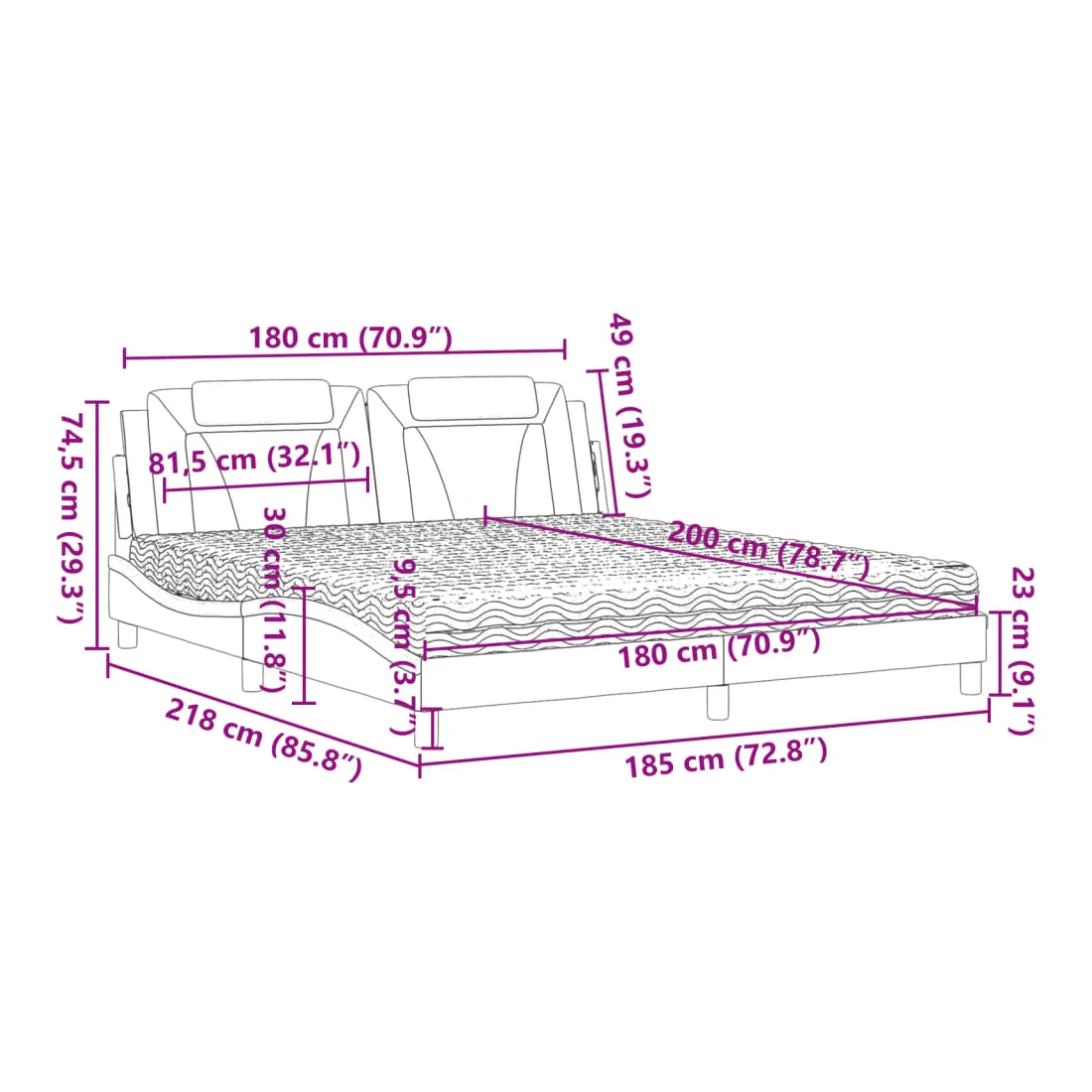 Obtenez une meilleure nuit de sommeil reposante grâce à ce lit avec matelas ! Il est un supplément accueillant à toute chambre à coucher. Similicuir durable : le similicuir de qualité supérieure est un matériau très durable. Il est résistant aux taches, ce qui le rend facile à nettoyer avec un chiffon humide. La surface lisse donne également un aspect luxueux et la beauté du cuir véritable. Lattes de contreplaqué : les lattes de contreplaqué assurent une bonne répartition du poids, garantissant que le matelas reste en place à chaque torsion de votre corps pendant le sommeil. Excellent soutien : l'oreiller de tête de lit est rembourré avec de la mousse pour un confort ultra doux et optimal vous offre un excellent soutien du dos lorsque vous êtes assis dans votre lit pour lire ou regarder la télévision. Matelas en mousse : ce matelas de lit en tissu à 3 couches est rempli de mousse PU 22D pour un confort optimal. Il contribue à soulager la fatigue et à favoriser la circulation sanguine, vous offrant ainsi une relaxation complète et une bonne qualité de sommeil. En outre, le matelas est disponible en dureté H2 et H3, de sorte que vous pouvez simplement tourner le matelas pour choisir la dureté qui vous convient le mieux. Design latéral ondulé : l’aspect ondulé du cadre de lit est élégant et sophistiqué, ajoutant une touche moderne et élégante à votre décor, ce qui en fait le point central de votre chambre à coucher.
