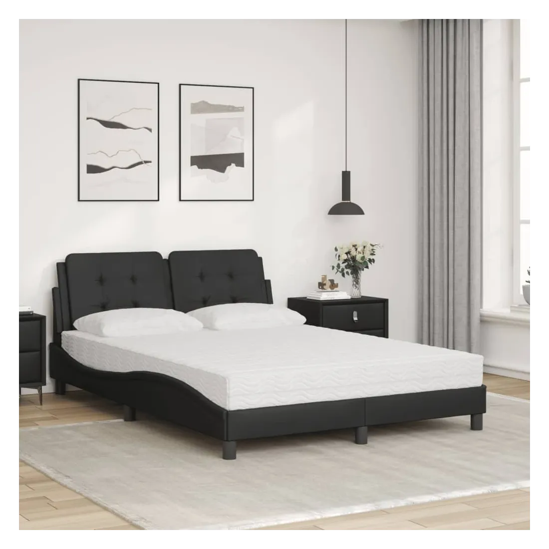 Obtenez une meilleure nuit de sommeil reposante grâce à ce lit avec matelas ! Il est un supplément accueillant à toute chambre à coucher. Similicuir durable : le similicuir de qualité supérieure est un matériau très durable. Il est résistant aux taches, ce qui le rend facile à nettoyer avec un chiffon humide. La surface lisse donne également un aspect luxueux et la beauté du cuir véritable. Lattes de contreplaqué : les lattes de contreplaqué assurent une bonne répartition du poids, garantissant que le matelas reste en place à chaque torsion de votre corps pendant le sommeil. Excellent soutien : l'oreiller de tête de lit est rembourré avec de la mousse pour un confort ultra doux et optimal vous offre un excellent soutien du dos lorsque vous êtes assis dans votre lit pour lire ou regarder la télévision. Matelas en mousse : ce matelas de lit en tissu à 3 couches est rempli de mousse PU 22D pour un confort optimal. Il contribue à soulager la fatigue et à favoriser la circulation sanguine, vous offrant ainsi une relaxation complète et une bonne qualité de sommeil. En outre, le matelas est disponible en dureté H2 et H3, de sorte que vous pouvez simplement tourner le matelas pour choisir la dureté qui vous convient le mieux. Design latéral ondulé : l’aspect ondulé du cadre de lit est élégant et sophistiqué, ajoutant une touche moderne et élégante à votre décor, ce qui en fait le point central de votre chambre à coucher.