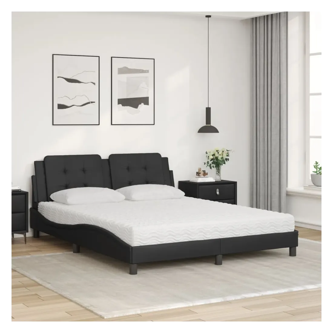 Obtenez une meilleure nuit de sommeil reposante grâce à ce lit avec matelas ! Il est un supplément accueillant à toute chambre à coucher. Similicuir durable : le similicuir de qualité supérieure est un matériau très durable. Il est résistant aux taches, ce qui le rend facile à nettoyer avec un chiffon humide. La surface lisse donne également un aspect luxueux et la beauté du cuir véritable. Lattes de contreplaqué : les lattes de contreplaqué assurent une bonne répartition du poids, garantissant que le matelas reste en place à chaque torsion de votre corps pendant le sommeil. Excellent soutien : l'oreiller de tête de lit est rembourré avec de la mousse pour un confort ultra doux et optimal vous offre un excellent soutien du dos lorsque vous êtes assis dans votre lit pour lire ou regarder la télévision. Matelas en mousse : ce matelas de lit en tissu à 3 couches est rempli de mousse PU 22D pour un confort optimal. Il contribue à soulager la fatigue et à favoriser la circulation sanguine, vous offrant ainsi une relaxation complète et une bonne qualité de sommeil. En outre, le matelas est disponible en dureté H2 et H3, de sorte que vous pouvez simplement tourner le matelas pour choisir la dureté qui vous convient le mieux. Design latéral ondulé : l’aspect ondulé du cadre de lit est élégant et sophistiqué, ajoutant une touche moderne et élégante à votre décor, ce qui en fait le point central de votre chambre à coucher.
