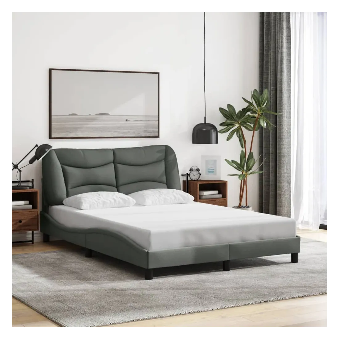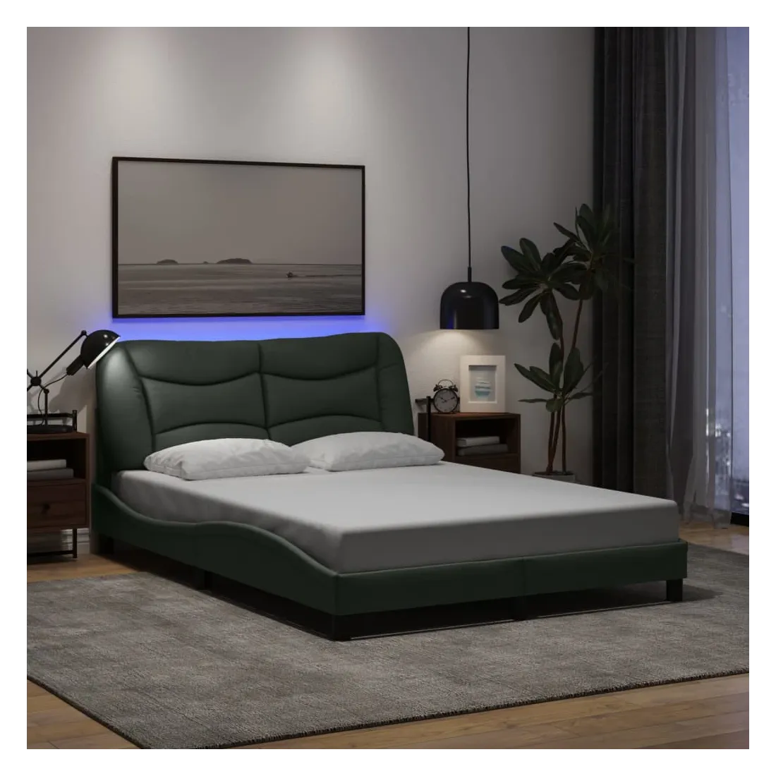 Obtenez une meilleure nuit de sommeil reposante grâce à ce cadre de lit avec lumières LED ! Il est un supplément accueillant à toute chambre à coucher. Tissu durable : le tissu présente un aspect simple et épuré, et il est respirant et durable.Lattes de contreplaqué : les lattes de contreplaqué assurent une bonne répartition du poids, garantissant que le matelas reste en place à chaque torsion de votre corps pendant le sommeil.Excellent soutien : la tête de lit vous offre un excellent soutien du dos lorsque vous êtes assis dans votre lit pour lire ou regarder la télévision.Bande LED colorée : apportez de la gaieté dans l'obscurité avec des lumières LED colorées ! Les bandes auto-agrippantes situées à l'arrière du coussin de la tête de lit peuvent être utilisées pour fixer les lumières LED.Design latéral ondulé : l’aspect ondulé du cadre de lit est élégant et sophistiqué, ajoutant une touche moderne et élégante à votre décor, ce qui en fait le point central de votre chambre à coucher. Bon à savoir :Un matelas n'est pas inclus avec ce lit. Nous offrons une sélection variée de matelas. Vous pouvez consulter notre boutique pour trouver un matelas assorti.Ce produit est doté d'un connecteur USB qui nécessite une source d'alimentation USB de 5V certifiée (non incluse).