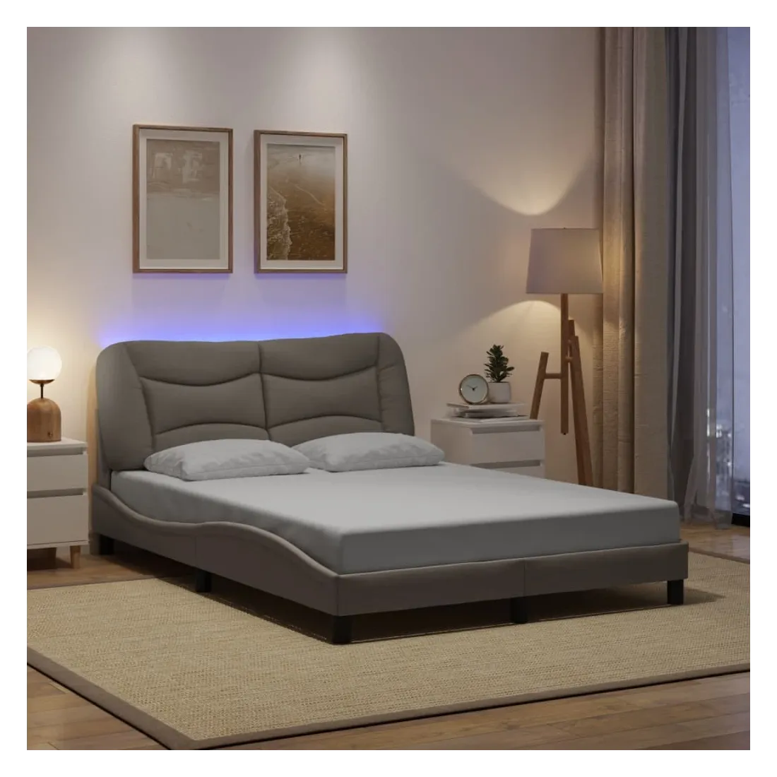 Obtenez une meilleure nuit de sommeil reposante grâce à ce cadre de lit avec lumières LED ! Il est un supplément accueillant à toute chambre à coucher. Tissu durable : le tissu présente un aspect simple et épuré, et il est respirant et durable.Lattes de contreplaqué : les lattes de contreplaqué assurent une bonne répartition du poids, garantissant que le matelas reste en place à chaque torsion de votre corps pendant le sommeil.Excellent soutien : la tête de lit vous offre un excellent soutien du dos lorsque vous êtes assis dans votre lit pour lire ou regarder la télévision.Bande LED colorée : apportez de la gaieté dans l'obscurité avec des lumières LED colorées ! Les bandes auto-agrippantes situées à l'arrière du coussin de la tête de lit peuvent être utilisées pour fixer les lumières LED.Design latéral ondulé : l’aspect ondulé du cadre de lit est élégant et sophistiqué, ajoutant une touche moderne et élégante à votre décor, ce qui en fait le point central de votre chambre à coucher. Bon à savoir :Un matelas n'est pas inclus avec ce lit. Nous offrons une sélection variée de matelas. Vous pouvez consulter notre boutique pour trouver un matelas assorti.Ce produit est doté d'un connecteur USB qui nécessite une source d'alimentation USB de 5V certifiée (non incluse).