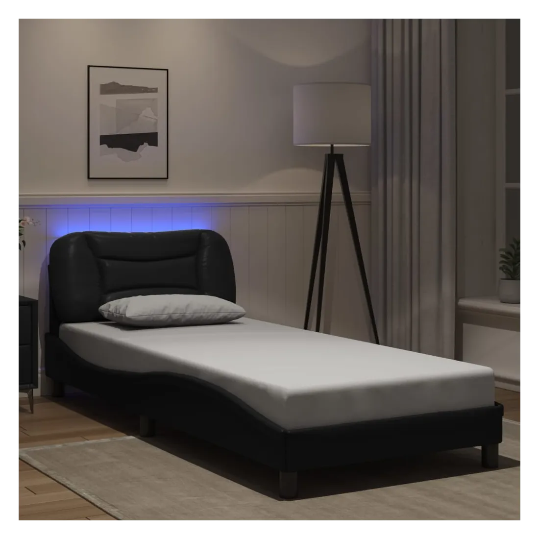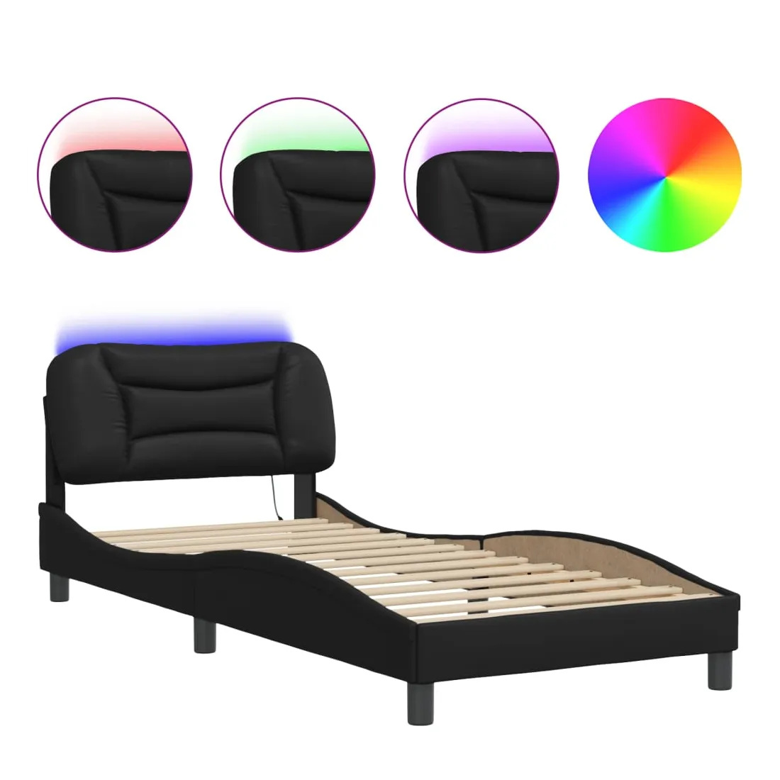 Obtenez une meilleure nuit de sommeil reposante grâce à ce cadre de lit avec lumières LED ! Il est un supplément accueillant à toute chambre à coucher. Similicuir durable : le similicuir de qualité supérieure est un matériau très durable. Il est résistant aux taches, ce qui le rend facile à nettoyer avec un chiffon humide. La surface lisse donne également un aspect luxueux et la beauté du cuir véritable.Lattes de contreplaqué : les lattes de contreplaqué assurent une bonne répartition du poids, garantissant que le matelas reste en place à chaque torsion de votre corps pendant le sommeil.Excellent soutien : la tête de lit vous offre un excellent soutien du dos lorsque vous êtes assis dans votre lit pour lire ou regarder la télévision.Bande LED colorée : apportez de la gaieté dans l'obscurité avec des lumières LED colorées ! Les bandes auto-agrippantes situées à l'arrière du coussin de la tête de lit peuvent être utilisées pour fixer les lumières LED.Design latéral ondulé : l’aspect ondulé du cadre de lit est élégant et sophistiqué, ajoutant une touche moderne et élégante à votre décor, ce qui en fait le point central de votre chambre à coucher. Bon à savoir :Un matelas n'est pas inclus avec ce lit. Nous offrons une sélection variée de matelas. Vous pouvez consulter notre boutique pour trouver un matelas assorti.Ce produit est doté d'un connecteur USB qui nécessite une source d'alimentation USB de 5V certifiée (non incluse).