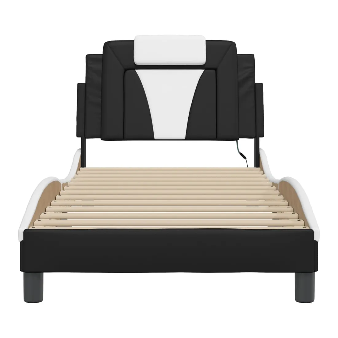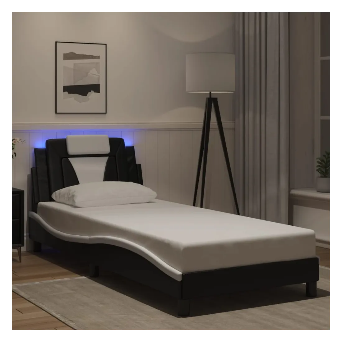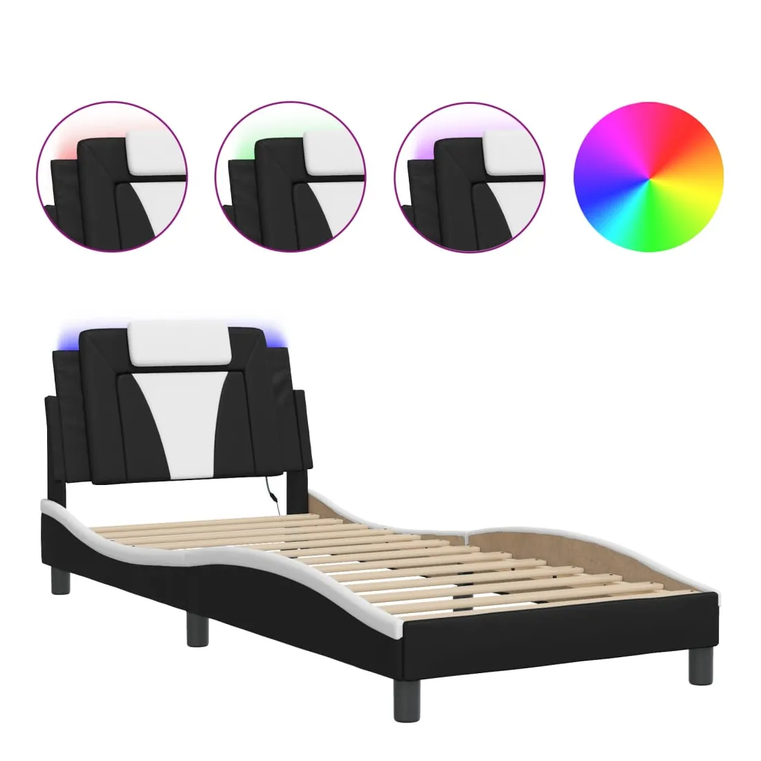 Obtenez une meilleure nuit de sommeil reposante grâce à ce cadre de lit avec lumières LED ! Il est un supplément accueillant à toute chambre à coucher. Similicuir durable : le similicuir de qualité supérieure est un matériau très durable. Il est résistant aux taches, ce qui le rend facile à nettoyer avec un chiffon humide. La surface lisse donne également un aspect luxueux et la beauté du cuir véritable.Lattes de contreplaqué : les lattes de contreplaqué assurent une bonne répartition du poids, garantissant que le matelas reste en place à chaque torsion de votre corps pendant le sommeil. Excellent soutien : l'oreiller de tête de lit est rembourré avec de la mousse pour un confort ultra doux et optimal vous offre un excellent soutien du dos lorsque vous êtes assis dans votre lit pour lire ou regarder la télévision. Bande LED colorée : apportez de la gaieté dans l'obscurité avec des lumières LED colorées ! Les bandes auto-agrippantes situées à l'arrière du coussin de la tête de lit peuvent être utilisées pour fixer les lumières LED. Design latéral ondulé : l’aspect ondulé du cadre de lit est élégant et sophistiqué, ajoutant une touche moderne et élégante à votre décor, ce qui en fait le point central de votre chambre à coucher. Bon à savoir :Un matelas n'est pas inclus avec ce lit. Nous offrons une sélection variée de matelas. Vous pouvez consulter notre boutique pour trouver un matelas assorti.Ce produit est doté d'un connecteur USB qui nécessite une source d'alimentation USB de 5V certifiée (non incluse).