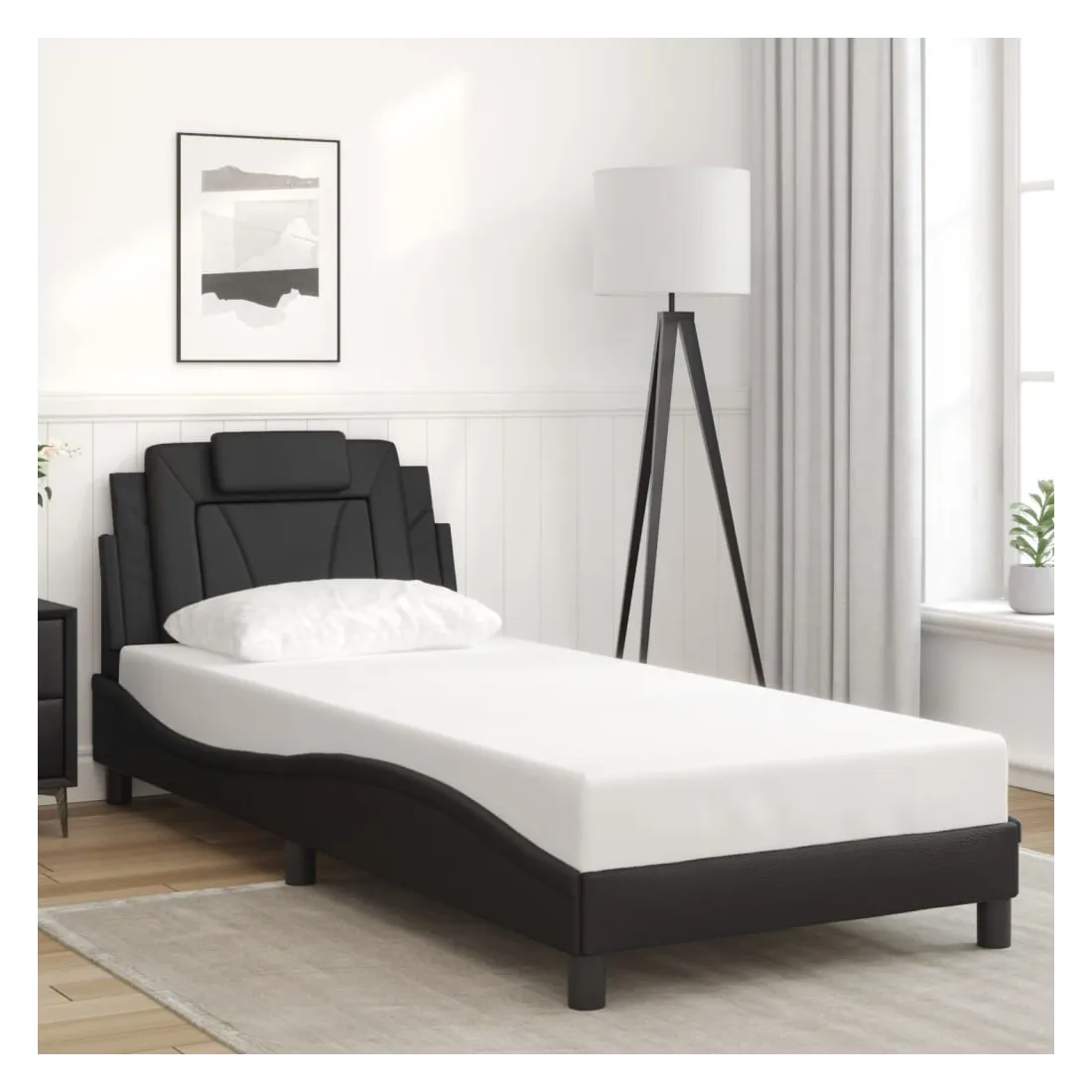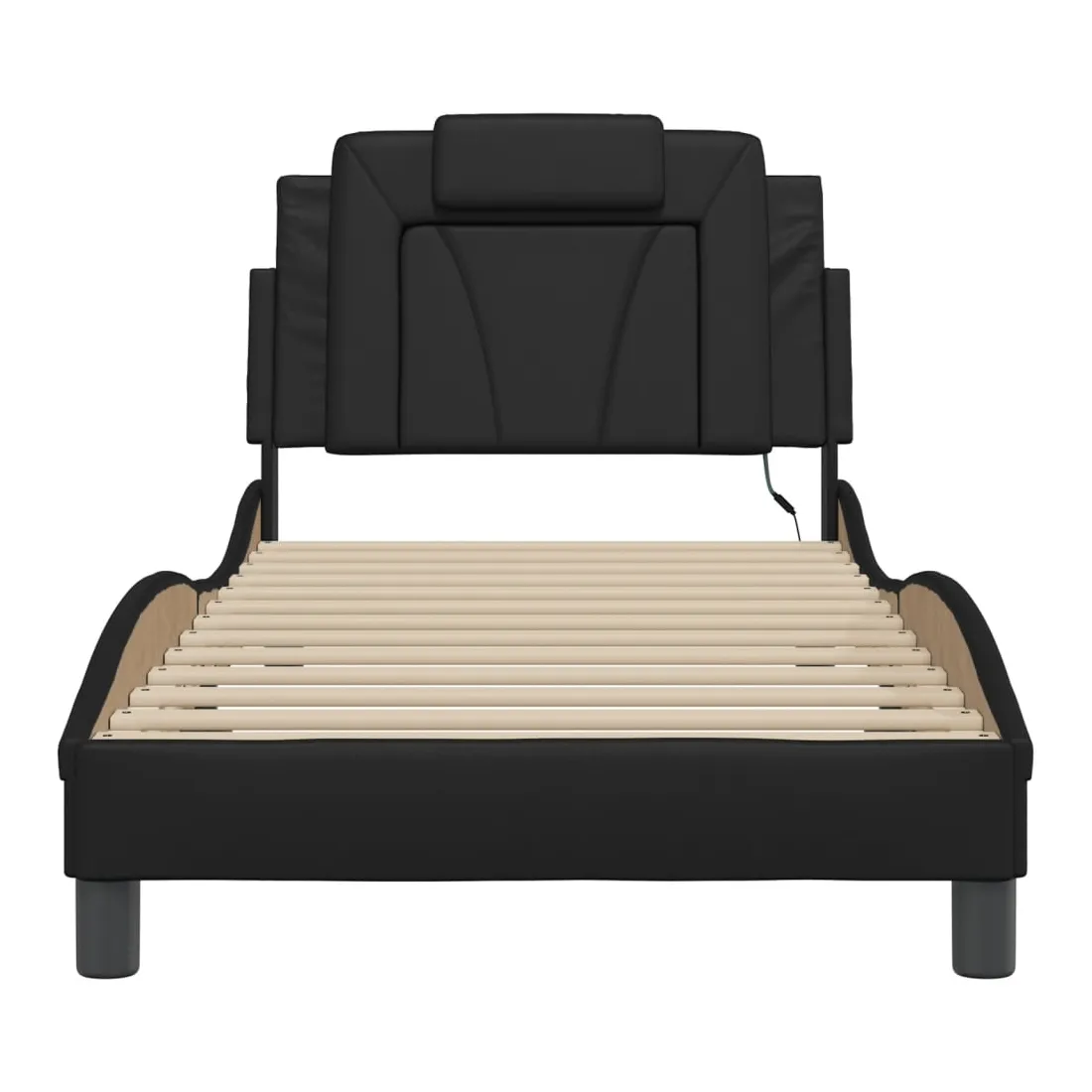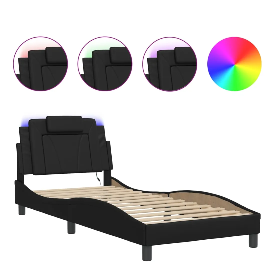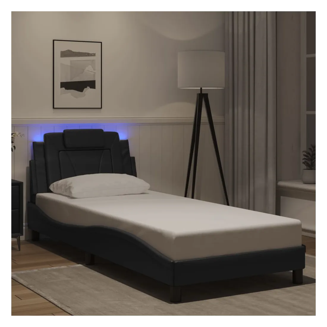 Obtenez une meilleure nuit de sommeil reposante grâce à ce cadre de lit avec lumières LED ! Il est un supplément accueillant à toute chambre à coucher. Similicuir durable : le similicuir de qualité supérieure est un matériau très durable. Il est résistant aux taches, ce qui le rend facile à nettoyer avec un chiffon humide. La surface lisse donne également un aspect luxueux et la beauté du cuir véritable.Lattes de contreplaqué : les lattes de contreplaqué assurent une bonne répartition du poids, garantissant que le matelas reste en place à chaque torsion de votre corps pendant le sommeil. Excellent soutien : l'oreiller de tête de lit est rembourré avec de la mousse pour un confort ultra doux et optimal vous offre un excellent soutien du dos lorsque vous êtes assis dans votre lit pour lire ou regarder la télévision. Bande LED colorée : apportez de la gaieté dans l'obscurité avec des lumières LED colorées ! Les bandes auto-agrippantes situées à l'arrière du coussin de la tête de lit peuvent être utilisées pour fixer les lumières LED. Design latéral ondulé : l’aspect ondulé du cadre de lit est élégant et sophistiqué, ajoutant une touche moderne et élégante à votre décor, ce qui en fait le point central de votre chambre à coucher. Bon à savoir :Un matelas n'est pas inclus avec ce lit. Nous offrons une sélection variée de matelas. Vous pouvez consulter notre boutique pour trouver un matelas assorti.Ce produit est doté d'un connecteur USB qui nécessite une source d'alimentation USB de 5V certifiée (non incluse).