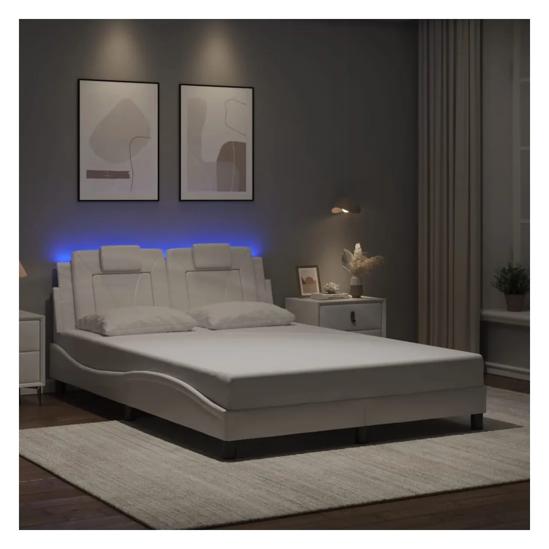 Obtenez une meilleure nuit de sommeil reposante grâce à ce cadre de lit avec lumières LED ! Il est un supplément accueillant à toute chambre à coucher. Similicuir durable : le similicuir de qualité supérieure est un matériau très durable. Il est résistant aux taches, ce qui le rend facile à nettoyer avec un chiffon humide. La surface lisse donne également un aspect luxueux et la beauté du cuir véritable.Lattes de contreplaqué : les lattes de contreplaqué assurent une bonne répartition du poids, garantissant que le matelas reste en place à chaque torsion de votre corps pendant le sommeil. Excellent soutien : l'oreiller de tête de lit est rembourré avec de la mousse pour un confort ultra doux et optimal vous offre un excellent soutien du dos lorsque vous êtes assis dans votre lit pour lire ou regarder la télévision. Bande LED colorée : apportez de la gaieté dans l'obscurité avec des lumières LED colorées ! Les bandes auto-agrippantes situées à l'arrière du coussin de la tête de lit peuvent être utilisées pour fixer les lumières LED. Design latéral ondulé : l’aspect ondulé du cadre de lit est élégant et sophistiqué, ajoutant une touche moderne et élégante à votre décor, ce qui en fait le point central de votre chambre à coucher. Bon à savoir :Un matelas n'est pas inclus avec ce lit. Nous offrons une sélection variée de matelas. Vous pouvez consulter notre boutique pour trouver un matelas assorti.Ce produit est doté d'un connecteur USB qui nécessite une source d'alimentation USB de 5V certifiée (non incluse).
