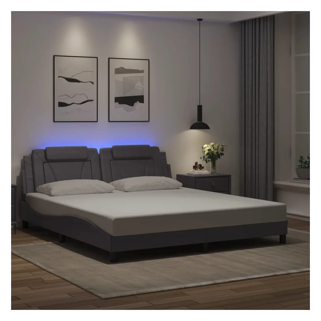 Obtenez une meilleure nuit de sommeil reposante grâce à ce cadre de lit avec lumières LED ! Il est un supplément accueillant à toute chambre à coucher. Similicuir durable : le similicuir de qualité supérieure est un matériau très durable. Il est résistant aux taches, ce qui le rend facile à nettoyer avec un chiffon humide. La surface lisse donne également un aspect luxueux et la beauté du cuir véritable.Lattes de contreplaqué : les lattes de contreplaqué assurent une bonne répartition du poids, garantissant que le matelas reste en place à chaque torsion de votre corps pendant le sommeil. Excellent soutien : l'oreiller de tête de lit est rembourré avec de la mousse pour un confort ultra doux et optimal vous offre un excellent soutien du dos lorsque vous êtes assis dans votre lit pour lire ou regarder la télévision. Bande LED colorée : apportez de la gaieté dans l'obscurité avec des lumières LED colorées ! Les bandes auto-agrippantes situées à l'arrière du coussin de la tête de lit peuvent être utilisées pour fixer les lumières LED. Design latéral ondulé : l’aspect ondulé du cadre de lit est élégant et sophistiqué, ajoutant une touche moderne et élégante à votre décor, ce qui en fait le point central de votre chambre à coucher. Bon à savoir :Un matelas n'est pas inclus avec ce lit. Nous offrons une sélection variée de matelas. Vous pouvez consulter notre boutique pour trouver un matelas assorti.Ce produit est doté d'un connecteur USB qui nécessite une source d'alimentation USB de 5V certifiée (non incluse).