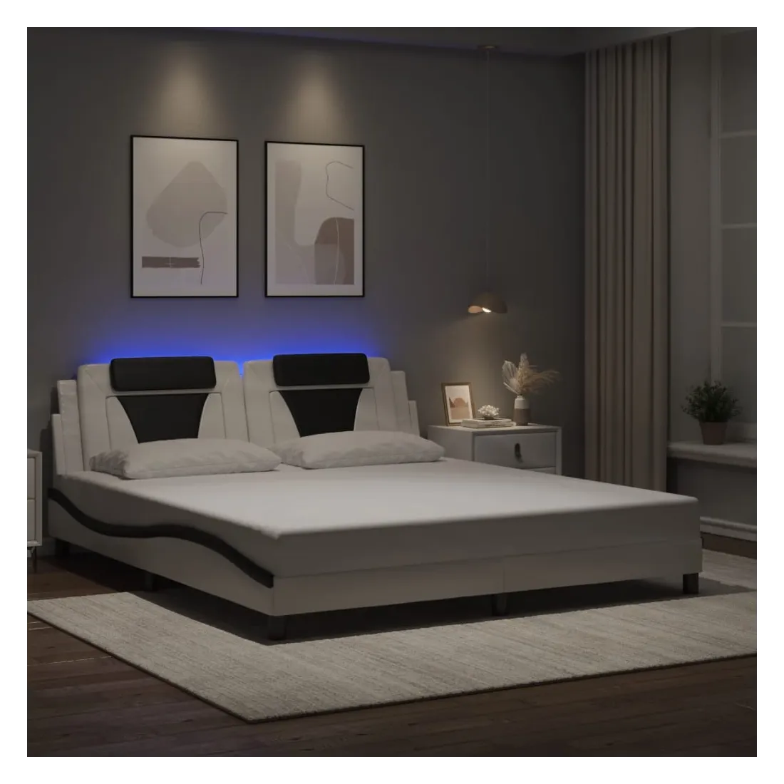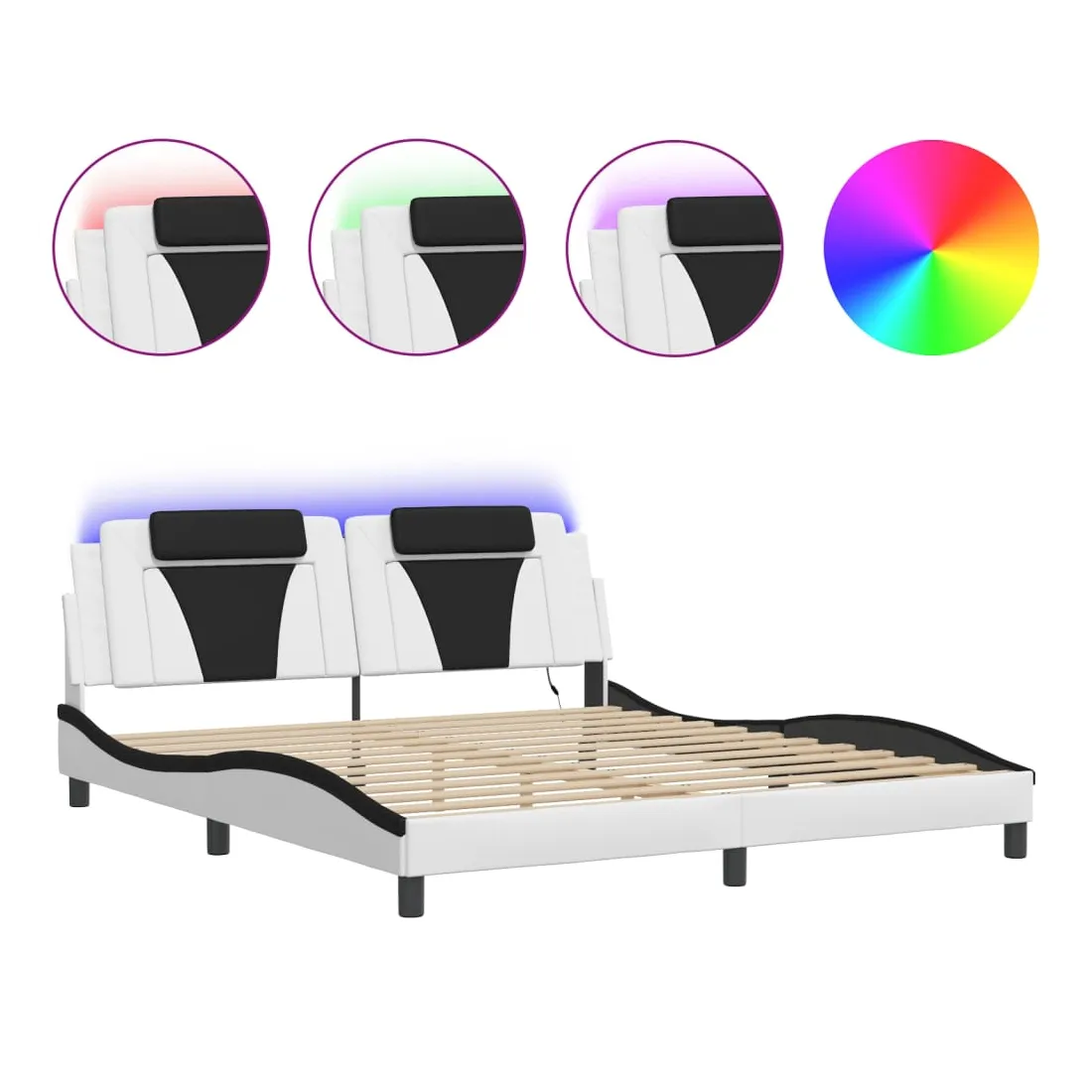 Obtenez une meilleure nuit de sommeil reposante grâce à ce cadre de lit avec lumières LED ! Il est un supplément accueillant à toute chambre à coucher. Similicuir durable : le similicuir de qualité supérieure est un matériau très durable. Il est résistant aux taches, ce qui le rend facile à nettoyer avec un chiffon humide. La surface lisse donne également un aspect luxueux et la beauté du cuir véritable.Lattes de contreplaqué : les lattes de contreplaqué assurent une bonne répartition du poids, garantissant que le matelas reste en place à chaque torsion de votre corps pendant le sommeil. Excellent soutien : l'oreiller de tête de lit est rembourré avec de la mousse pour un confort ultra doux et optimal vous offre un excellent soutien du dos lorsque vous êtes assis dans votre lit pour lire ou regarder la télévision. Bande LED colorée : apportez de la gaieté dans l'obscurité avec des lumières LED colorées ! Les bandes auto-agrippantes situées à l'arrière du coussin de la tête de lit peuvent être utilisées pour fixer les lumières LED. Design latéral ondulé : l’aspect ondulé du cadre de lit est élégant et sophistiqué, ajoutant une touche moderne et élégante à votre décor, ce qui en fait le point central de votre chambre à coucher. Bon à savoir :Un matelas n'est pas inclus avec ce lit. Nous offrons une sélection variée de matelas. Vous pouvez consulter notre boutique pour trouver un matelas assorti.Ce produit est doté d'un connecteur USB qui nécessite une source d'alimentation USB de 5V certifiée (non incluse).