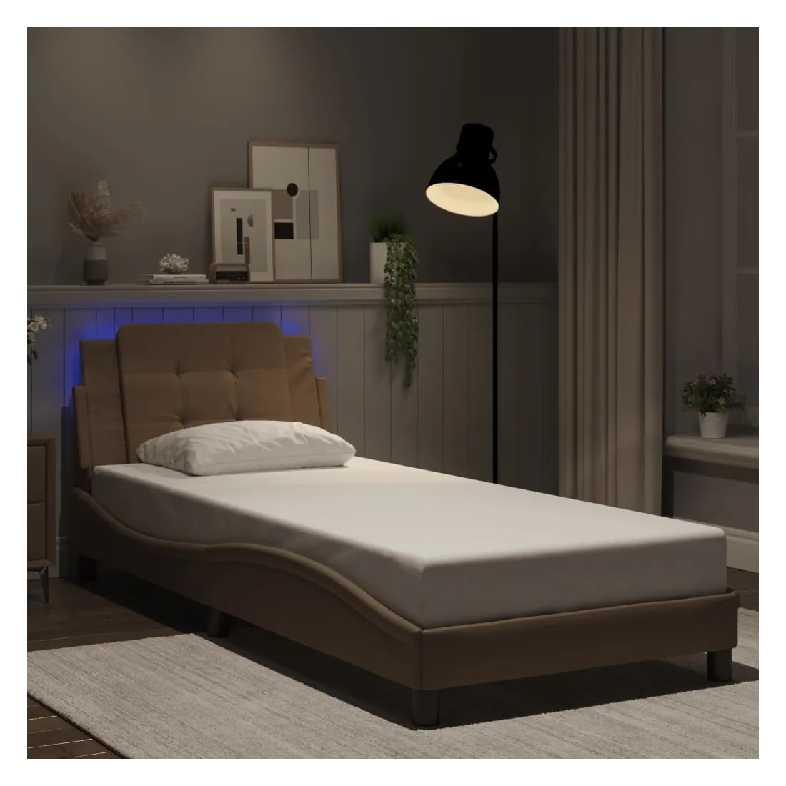 Obtenez une meilleure nuit de sommeil reposante grâce à ce cadre de lit avec lumières LED ! Il est un supplément accueillant à toute chambre à coucher. Similicuir durable : le similicuir de qualité supérieure est un matériau très durable. Il est résistant aux taches, ce qui le rend facile à nettoyer avec un chiffon humide. La surface lisse donne également un aspect luxueux et la beauté du cuir véritable.Lattes de contreplaqué : les lattes de contreplaqué assurent une bonne répartition du poids, garantissant que le matelas reste en place à chaque torsion de votre corps pendant le sommeil.Excellent soutien : la tête de lit vous offre un excellent soutien du dos lorsque vous êtes assis dans votre lit pour lire ou regarder la télévision.Bande LED colorée : apportez de la gaieté dans l'obscurité avec des lumières LED colorées ! Les bandes auto-agrippantes situées à l'arrière du coussin de la tête de lit peuvent être utilisées pour fixer les lumières LED.Design latéral ondulé : l’aspect ondulé du cadre de lit est élégant et sophistiqué, ajoutant une touche moderne et élégante à votre décor, ce qui en fait le point central de votre chambre à coucher. Bon à savoir :Un matelas n'est pas inclus avec ce lit. Nous offrons une sélection variée de matelas. Vous pouvez consulter notre boutique pour trouver un matelas assorti.Ce produit est doté d'un connecteur USB qui nécessite une source d'alimentation USB de 5V certifiée (non incluse).