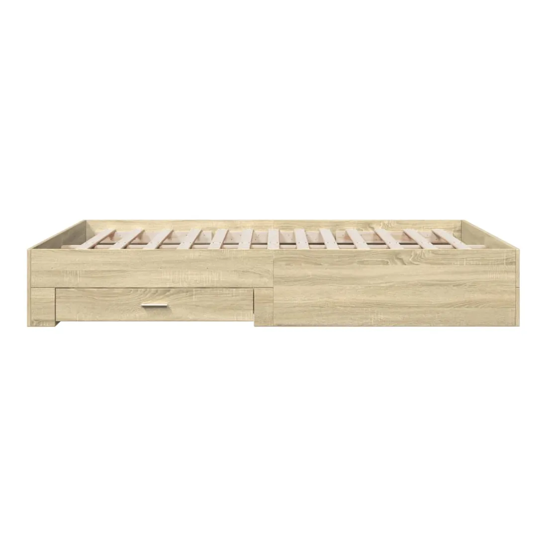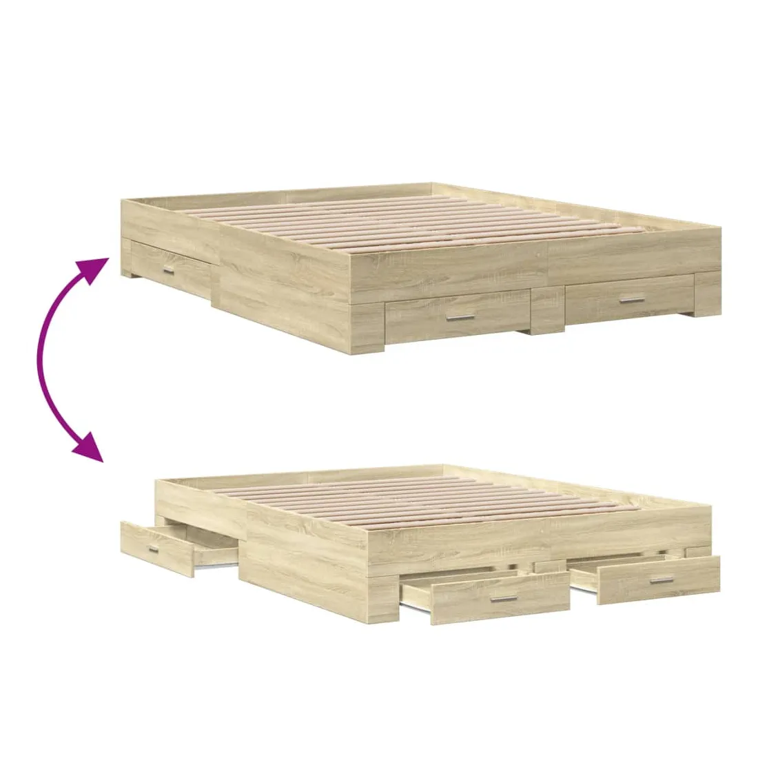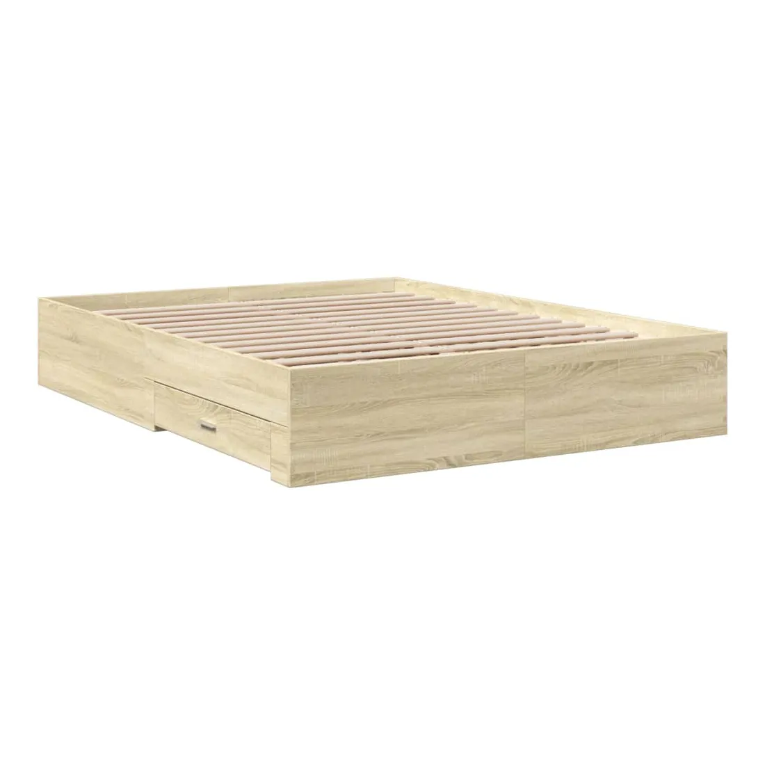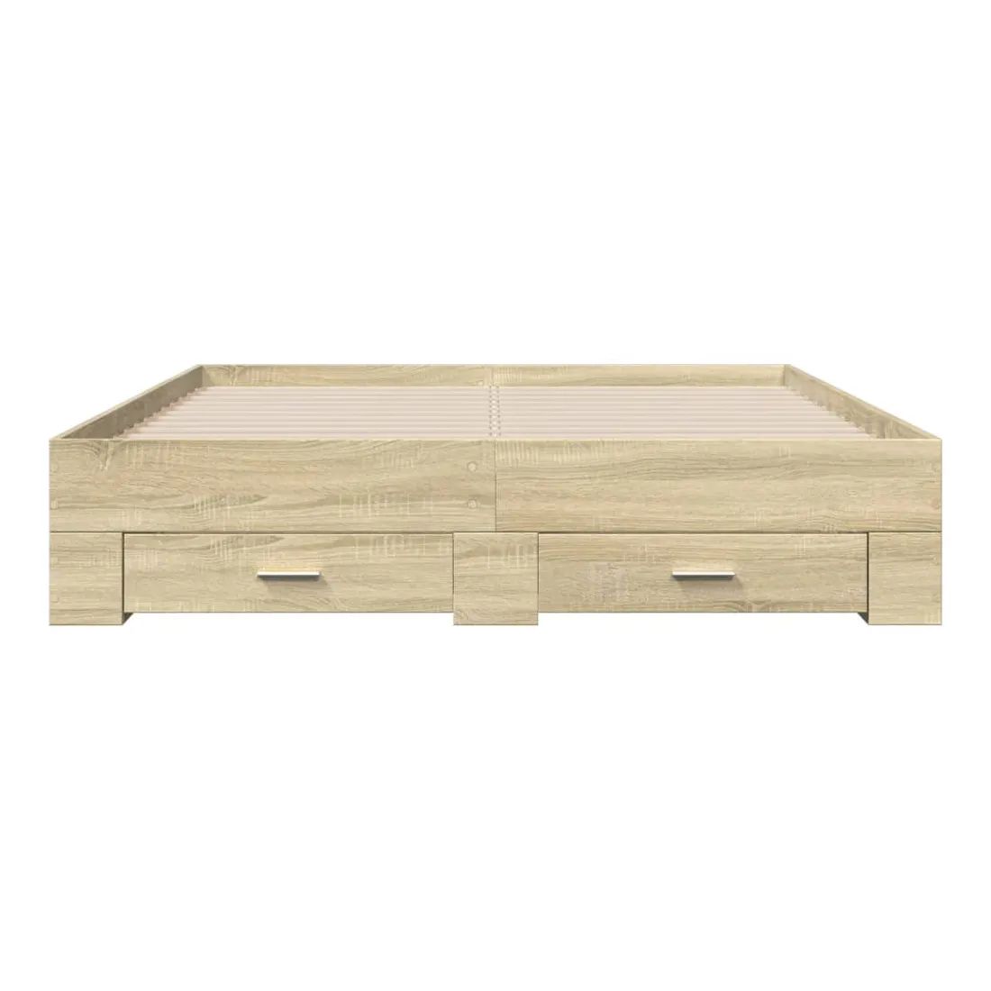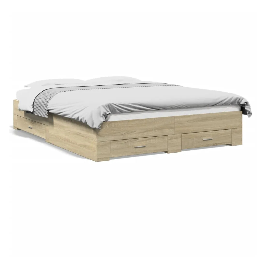 Ajoutez une touche moderne à votre chambre à coucher avec ce cadre de lit avec tiroirs ! Il apportera une touche pratique et décorative à votre espace de vie. Matériau durable : le cadre de lit est fabriquée en bois d'ingénierie. Le bois d'ingénierie est d'une qualité exceptionnelle avec une surface lisse et présente également de la résistance, de la stabilité et de la résistance à l'humidité.Lattes robustes : les lattes de contreplaqué assurent une bonne répartition du poids, garantissant que le matelas reste en place à chaque torsion de votre corps pendant le sommeil.Fonction de rangement : les tiroirs de lit inclus offrent suffisamment d'espace de rangement pour ranger vos articles essentiels, gardant votre pièce propre et bien rangée. Bon à savoir :Un matelas n'est pas inclus avec ce lit. Nous offrons une sélection variée de matelas. Vous pouvez consulter notre boutique pour trouver un matelas assorti.
