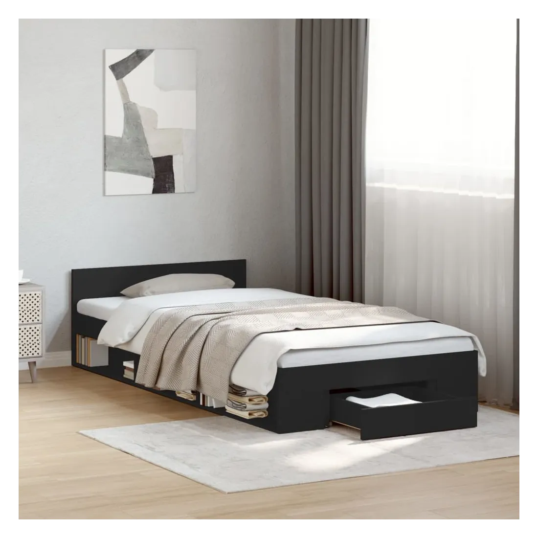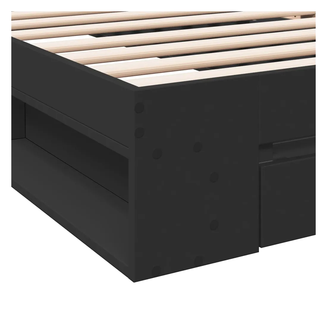 Ajoutez une touche moderne à votre chambre à coucher avec ce cadre de lit avec tiroir ! Il apportera une touche pratique et décorative à votre espace de vie. Matériau durable : le cadre de lit est fabriquée en bois d'ingénierie. Le bois d'ingénierie est d'une qualité exceptionnelle avec une surface lisse et présente également de la résistance, de la stabilité et de la résistance à l'humidité.Lattes robustes : les lattes de contreplaqué assurent une bonne répartition du poids, garantissant que le matelas reste en place à chaque torsion de votre corps pendant le sommeil.Fonction de rangement : le tiroir de lit et les compartiments latéraux inclus offrent suffisamment d'espace de rangement pour ranger vos articles essentiels, gardant votre pièce propre et bien rangée. Bon à savoir :Un matelas n'est pas inclus avec ce lit. Nous offrons une sélection variée de matelas. Vous pouvez consulter notre boutique pour trouver un matelas assorti.