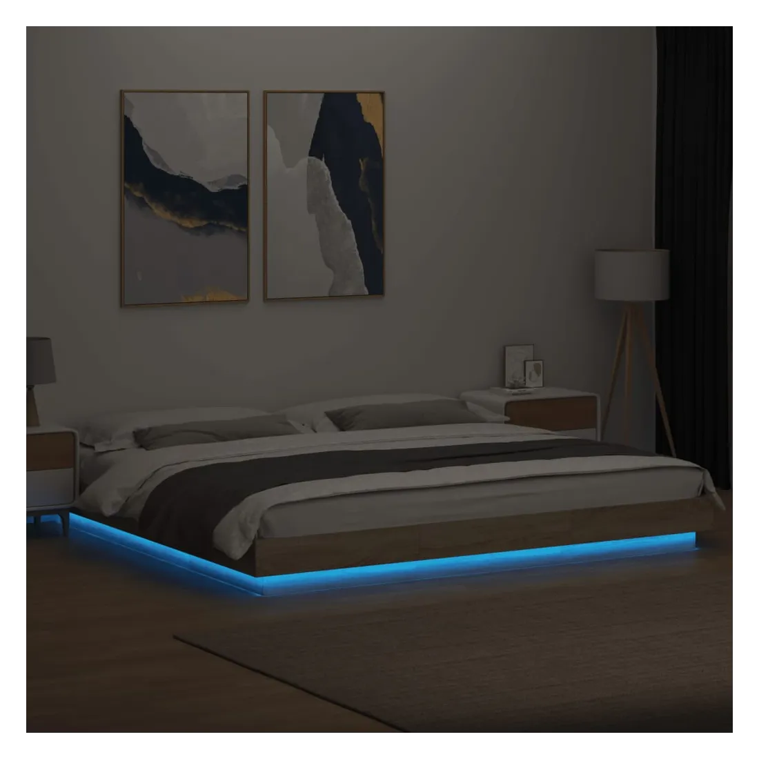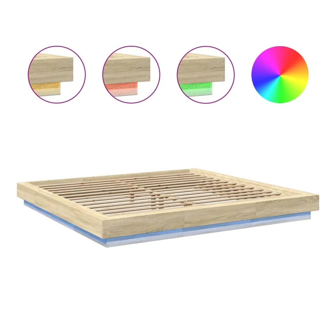 Obtenez une meilleure nuit de sommeil reposante grâce à ce cadre de lit avec lumières LED ! Il est un supplément accueillant à toute chambre à coucher. Matériau durable : le bois d'ingénierie est d'une qualité exceptionnelle avec une surface lisse et présente également résistance, stabilité et résistance à l'humidité. Lumières LED RVB : le cadre de lit est équipé de lumières LED RVB vibrantes. Avec divers menus personnalisables, vous pouvez changer sans effort la couleur des lumières et même les régler automatiquement. Ces lumières LED renforcent non seulement l'aspect contemporain du sommier, mais ajoutent également à son attrait tendance. Lattes robustes : les lattes de contreplaqué assurent une bonne répartition du poids, garantissant que le matelas reste en place à chaque torsion de votre corps pendant le sommeil. Bon à savoir :Un matelas n'est pas inclus avec ce lit. Nous offrons une sélection variée de matelas. Vous pouvez consulter notre boutique pour trouver un matelas assorti. Ce produit est doté d'un connecteur USB qui nécessite une source d'alimentation USB de 5V certifiée (non incluse).