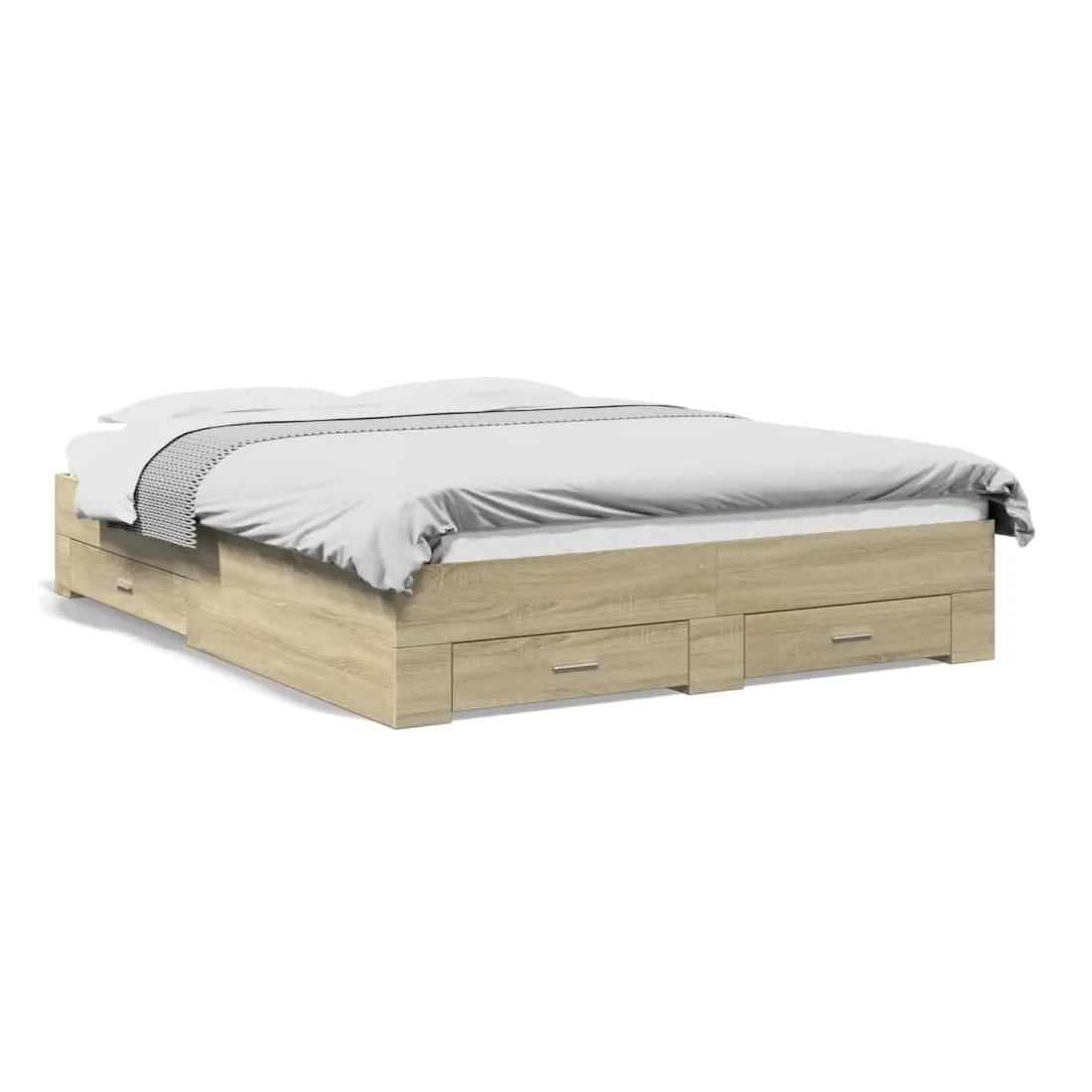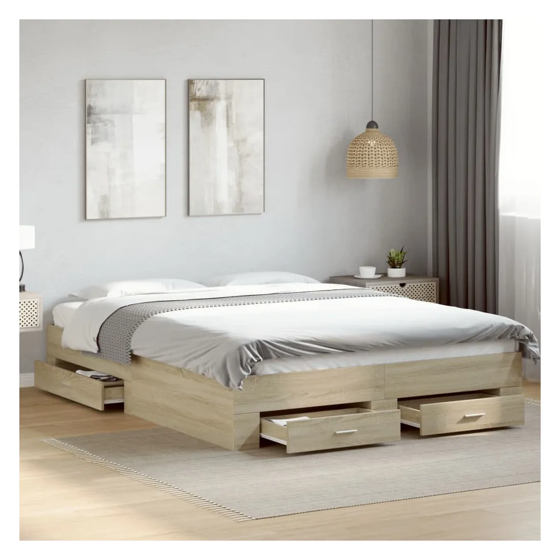 Ajoutez une touche moderne à votre chambre à coucher avec ce cadre de lit avec tiroirs ! Il apportera une touche pratique et décorative à votre espace de vie. Matériau durable : le cadre de lit est fabriquée en bois d'ingénierie. Le bois d'ingénierie est d'une qualité exceptionnelle avec une surface lisse et présente également de la résistance, de la stabilité et de la résistance à l'humidité.Lattes robustes : les lattes de contreplaqué assurent une bonne répartition du poids, garantissant que le matelas reste en place à chaque torsion de votre corps pendant le sommeil.Fonction de rangement : les tiroirs de lit inclus offrent suffisamment d'espace de rangement pour ranger vos articles essentiels, gardant votre pièce propre et bien rangée. Bon à savoir :Un matelas n'est pas inclus avec ce lit. Nous offrons une sélection variée de matelas. Vous pouvez consulter notre boutique pour trouver un matelas assorti.