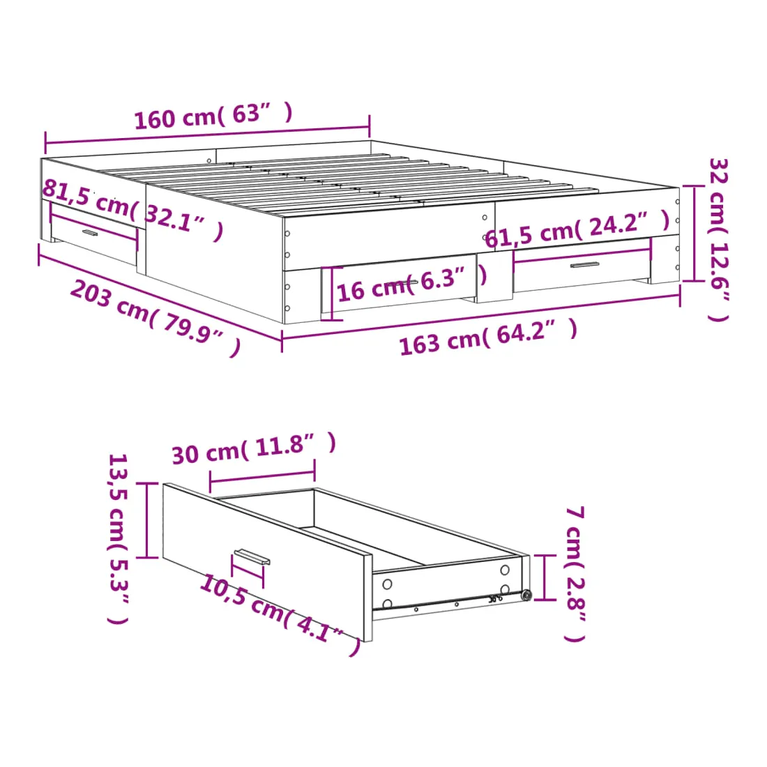 - Dimensions des tiroirs de lit (S) : 61,5 x 31,5 x 13,5 cm (L x l x H)