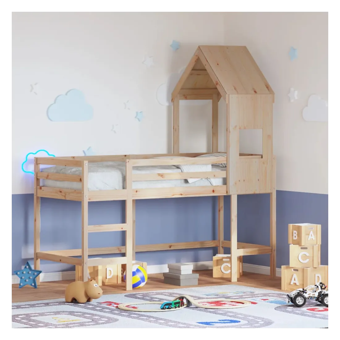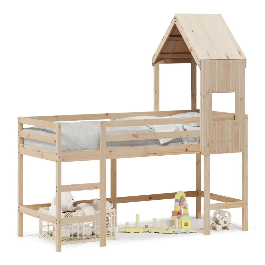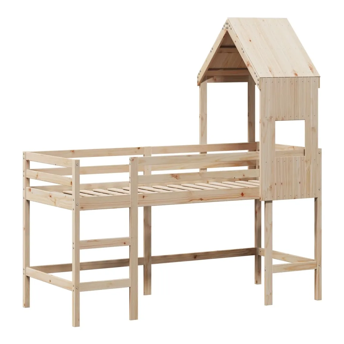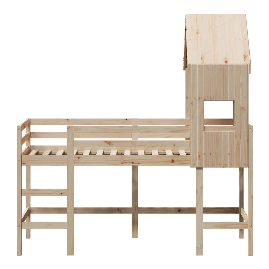 Ce lit mezzanine pour enfants a été fabriqué en pin massif et est conçu pour recevoir et optimiser l'espace. Bois de pin massif : le bois de pin massif est un matériau naturel magnifique. Le bois de pin a un grain droit et les nœuds donnent au matériau son aspect caractéristique et rustique.Utilisation complète de l'espace : ce lit mezzanine simple est surélevé de 78,5 cm au-dessus du sol, offrant suffisamment d'espace en dessous pour le rangement ou d'autres activités. Cet espace peut être utilisé pour empiler des boîtes de rangement, ranger de gros jouets ou même placer un canapé pour enfants pour lire. De plus, votre enfant peut utiliser l'espace sous le cadre de lit en bois comme base secrète et profiter de jeux imaginatifs.Barrières de sécurité : le lit mezzanine pour enfants est équipé de garde-corps de sécurité sur les 4 côtés, afin que votre enfant puisse dormir sans craindre de tomber.Échelle pratique : ce lit mezzanine pour enfants est doté d'une échelle qui permet de monter et de descendre dans et du lit en toute simplicité. Elle apporte également de la joie et transforme leur chambre en terrain de jeu intérieur.Porte latérale ouverte : le toit est doté d'une porte latérale ouverte qui permet à vos enfants d'entrer et de sortir facilement du lit. Bon à savoir :Un matelas n'est pas inclus avec ce lit. Nous offrons une sélection variée de matelas. Vous pouvez consulter notre boutique pour trouver un matelas assorti. Attention :Pour éviter qu'il ne bascule, ce produit doit être utilisé avec le dispositif de fixation murale fourni.