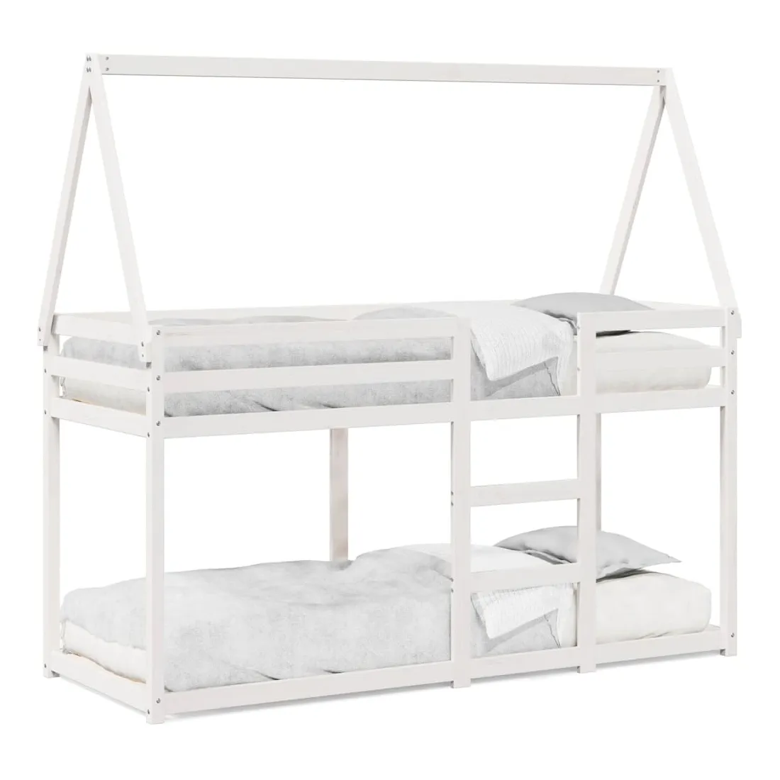 Ce lit superposé pour enfants avec toit est élégant et fonctionnel, ce qui en fait un ajout parfait à toute pièce avec un espace limité. Bois de pin massif : le bois de pin massif est un matériau naturel magnifique. Le bois de pin a un grain droit et les nœuds donnent au matériau son aspect caractéristique et rustique.Design sûr : le lit surélevé est conçu dans un souci de sécurité. Il comprend des garde-corps qui empêchent l'utilisateur de rouler pendant son sommeil.Lattes de contreplaqué : les lattes de contreplaqué assurent une bonne répartition du poids, garantissant que le matelas reste en place à chaque torsion de votre corps pendant le sommeil.Très amusant : en combinant le toit avec le lit de votre enfant, vous pouvez créer une cachette qui permettra à votre enfant de s'amuser à l'heure du coucher. Cette addition innovante non seulement sera un point focal passionnant, mais aussi apportera de la fantaisie et de l'amusement dans la chambre d'enfant.Convient aux espaces limités : le cadre de lit est un excellent choix pour toute pièce dont l'espace est limité, il fournit deux lits individuels avec un design compact.Porte latérale ouverte : le toit est doté d'une porte latérale ouverte qui permet à vos enfants d'entrer et de sortir facilement du lit. Bon à savoir :Un matelas n'est pas inclus avec ce lit. Nous offrons une sélection variée de matelas. Vous pouvez consulter notre boutique pour trouver un matelas assorti.