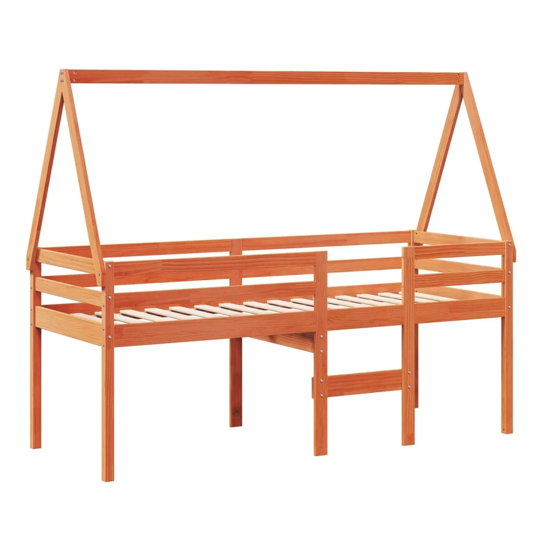 Ce lit haut, dont la polyvalence est au cœur de son design, est une combinaison parfaite de style moderne et élégant et de praticité. Il est idéal pour les petites pièces. Bois de pin massif : le bois de pin massif est un matériau naturel magnifique. Le bois de pin a un grain droit et les nœuds donnent au matériau son aspect caractéristique et rustique.Fonction pratique : le lit surélevé offre un excellent moyen d'utiliser l'espace au sol dans la chambre de votre enfant, vous pouvez le combiner avec un rideau de jeu cool, un matelas de jeu et un panneau d'abri comme un coin de jeu ou utiliser la zone en dessous pour le stockage. Les lattes en contreplaqué offrent un soutien supplémentaire à votre lit. Elles prolongent la durée de vie de votre matelas en absorbant la majeure partie de la tension et du poids du lit.Design sûr : l'échelle intégrée du lit surélevé facilite l'entrée et la sortie du lit, et les garde-corps garantissent la sécurité de vos jeunes pendant qu'ils dorment.Très amusant : en combinant le toit avec le lit de votre enfant, vous pouvez créer une cachette qui permettra à votre enfant de s'amuser à l'heure du coucher. Cette addition innovante non seulement sera un point focal passionnant, mais aussi apportera de la fantaisie et de l'amusement dans la chambre d'enfant.Porte latérale ouverte : le toit est doté d'une porte latérale ouverte qui permet à vos enfants d'entrer et de sortir facilement du lit. Bon à savoir :Un matelas n'est pas inclus avec ce lit. Nous offrons une sélection variée de matelas. Vous pouvez consulter notre boutique pour trouver un matelas assorti.