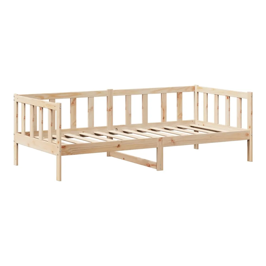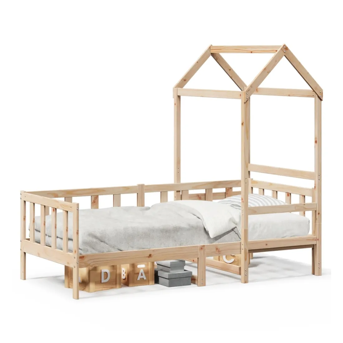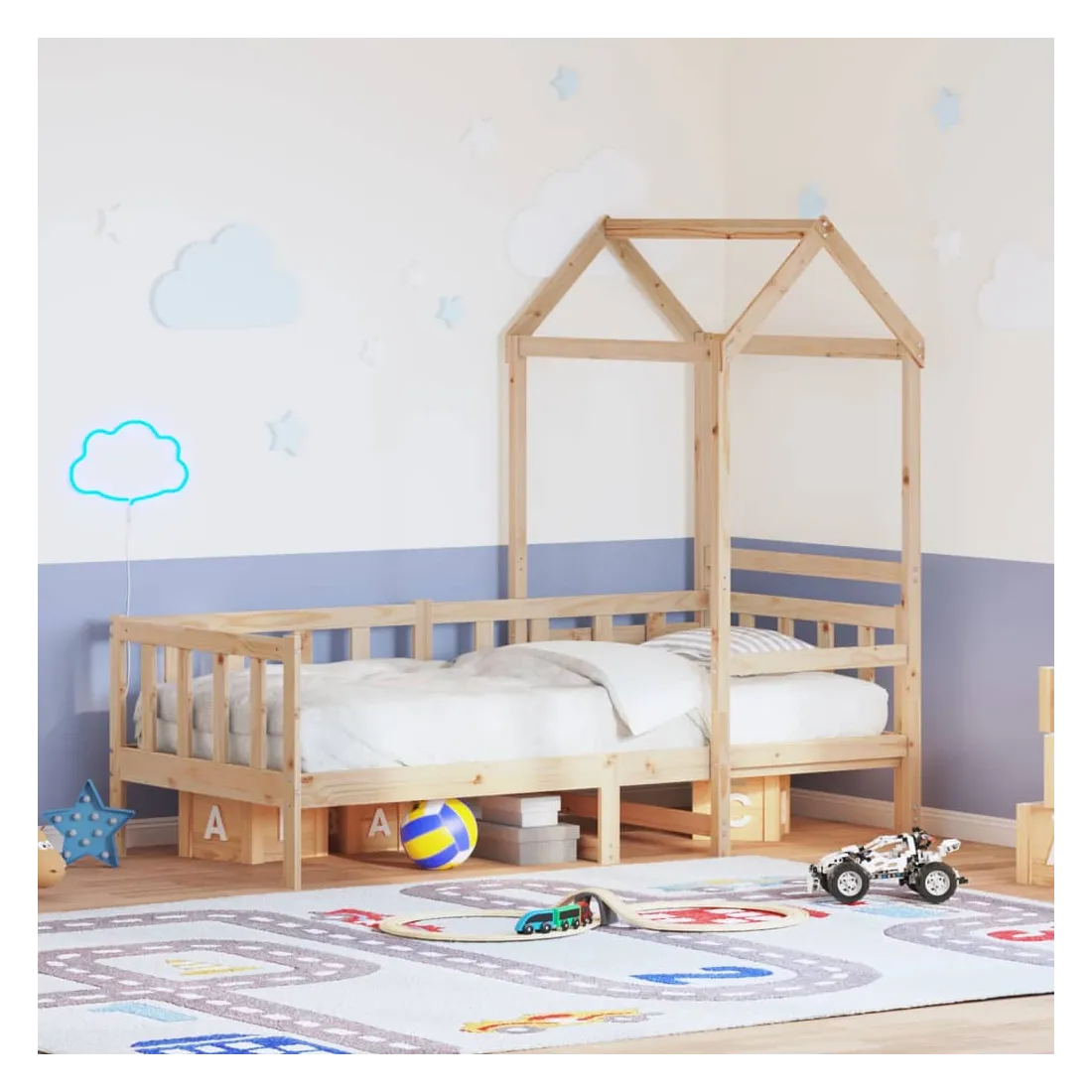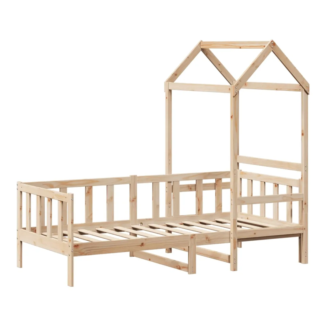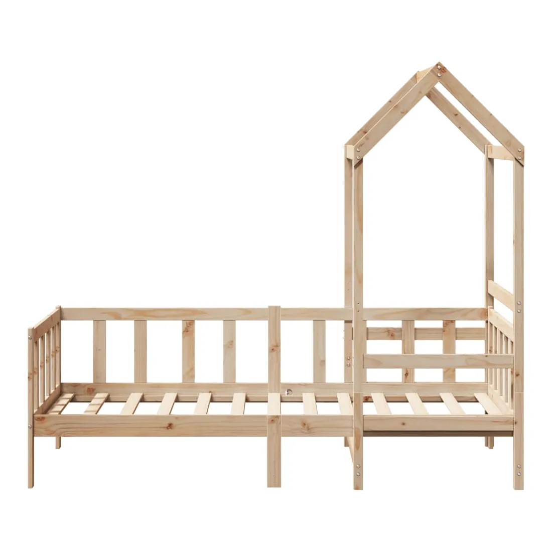 Ce lit de jour polyvalent en bois peut être utilisé comme un lit dans la chambre à coucher et est également idéal comme un canapé dans le salon. Il s'adapte parfaitement à vos différents besoins, vous offrant beaucoup d'espace pour dormir et vous reposer. Bois de pin massif : le bois de pin massif est un matériau naturel magnifique. Le bois de pin a un grain droit et les nœuds donnent au matériau son aspect caractéristique et rustique.Barres de lit sur 3 côtés : ce lit d'appoint présente un design unique sur le côté du lit, ce qui offre un sentiment de sécurité et ajoute une touche de style sophistiqué à votre intérieur.Design à lattes : le sommier à lattes en bois permet une meilleure circulation de l'air pour garder le matelas frais plus longtemps, améliorant la capacité de poids du lit et assurant la stabilité.Espace de rangement supplémentaire : profitez de l'espace sous le canapé pour ranger divers objets. Parfait pour ranger des boîtes pour organiser des vêtements, des jouets ou des couettes.Très amusant : en combinant le toit avec votre canapé-lit, vous pouvez créer une cachette qui permettra à votre enfant de s'amuser à l'heure du coucher. Cet ajout innovant sera non seulement un point focal passionnant, mais il apportera également de l'émerveillement et de l'excitation dans la chambre.Porte latérale ouverte : le toit est doté d'une porte latérale ouverte qui permet à vos enfants d'entrer et de sortir facilement du lit. Bon à savoir :Un matelas n'est pas inclus avec ce lit. Nous offrons une sélection variée de matelas. Vous pouvez consulter notre boutique pour trouver un matelas assorti.