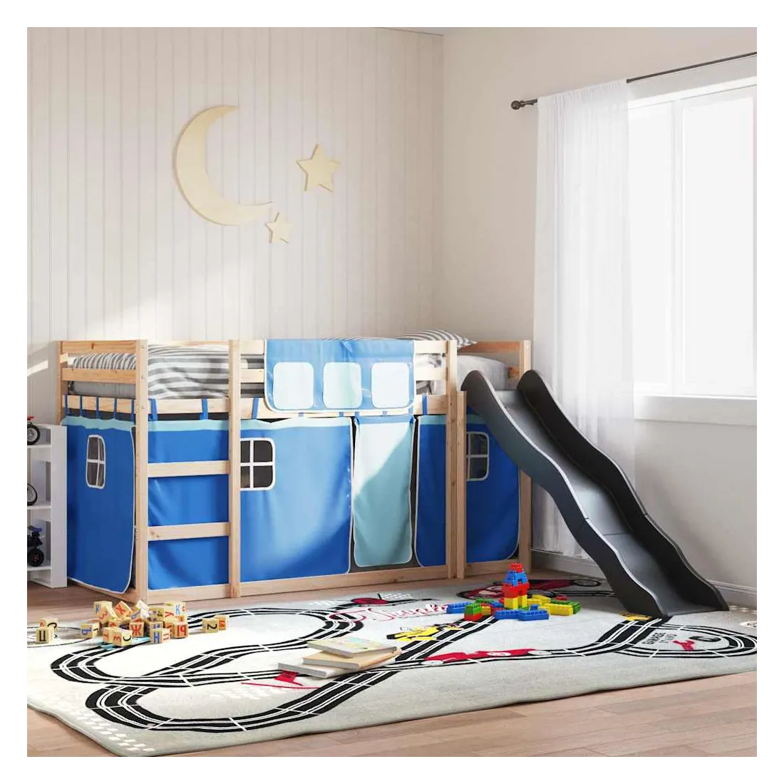 Ce lit superposé en bois est élégant et fonctionnel, ce qui en fait un supplément parfait à toute pièce dont l'espace est limité. Bois de pin massif : ce lit superposé est fabriqué en bois de pin massif pour plus de stabilité et de durabilité. Le bois de pin a un grain droit et les nœuds donnent au matériau son aspect rustique caractéristique.Très amusant : vous pouvez combiner les rideaux avec le lit superposé bas pour créer la base secrète de votre enfant, ce qui permet de s’amuser à l’heure du coucher et d’ajouter un point d'intérêt à la chambre à coucher !Barrières de sécurité : le lit supérieur est équipé de garde-corps de sécurité sur les 4 côtés, afin que votre enfant puisse dormir sans craindre de tomber.Échelle et toboggan pratiques : ce lit superposé est doté d'un toboggan amusant qui apporte de la joie et transforme leur chambre en une aire de jeux intérieure. La combinaison d'une échelle d'escalade et d'un toboggan rend l'heure du coucher plus vivante et plus intéressante pour les enfants.Lattes robustes : les lattes de contreplaqué assurent une bonne répartition du poids, garantissant que le matelas reste en place à chaque torsion de votre corps pendant le sommeil. Bon à savoir :Un matelas n'est pas inclus avec ce lit. Nous offrons une sélection variée de matelas. Vous pouvez consulter notre boutique pour trouver un matelas assorti. Attention :Pour éviter qu'il ne bascule, ce produit doit être utilisé avec le dispositif de fixation murale fourni.