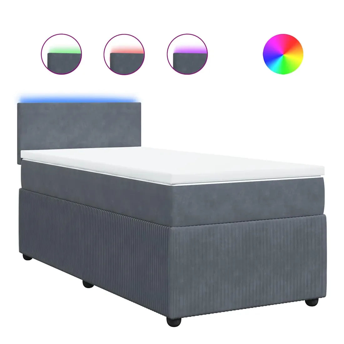 Utilisez ce lit à sommier pour profiter d'une nuit de sommeil réparatrice ! Il vous offre une relaxation maximale et un sommeil agréable. Matériau doux et confortable : le tissu en velours présente une surface douce et lisse qui offre une sensation agréable contre la peau, vous apportant chaleur et confort ultime.Matelas à ressorts ensachés : ce matelas à ressorts ensachés comporte des ressorts ensachés individuels qui fonctionnent indépendamment pour offrir un soutien personnalisé en réagissant uniquement à la pression exercée dans chaque zone. Cette conception empêche « l'enroulement » et réduit le transfert de mouvement par rapport aux matelas traditionnels à ressorts ouverts. Chaque ressort ensaché soutient le corps individuellement.Lumières LED pour une ambiance agréable : ce lit est équipé de lumières LED qui peuvent être facilement réglées pour créer un spectacle lumineux personnalisé. Vous pouvez personnaliser les modes, les couleurs et la luminosité pour améliorer l'ambiance de votre espace intérieur.Surmatelas confortable : ce surmatelas améliore le soutien et le confort grâce à sa surface douce et respirante, tout en prolongeant la durée de vie de votre matelas. Sa housse amovible permet un lavage facile, ce qui facilite l'entretien. Bon à savoir :Ce produit est doté d'un connecteur USB qui nécessite une source d'alimentation USB de 5V certifiée (non incluse).Pour des raisons d'hygiène, le matelas ne peut pas être retourné si l'emballage est retiré ou ouvert.Seule la partie avec un symbole de ciseaux peut être coupée et seule la partie avec l'USB continuera à fonctionner comme avant.
