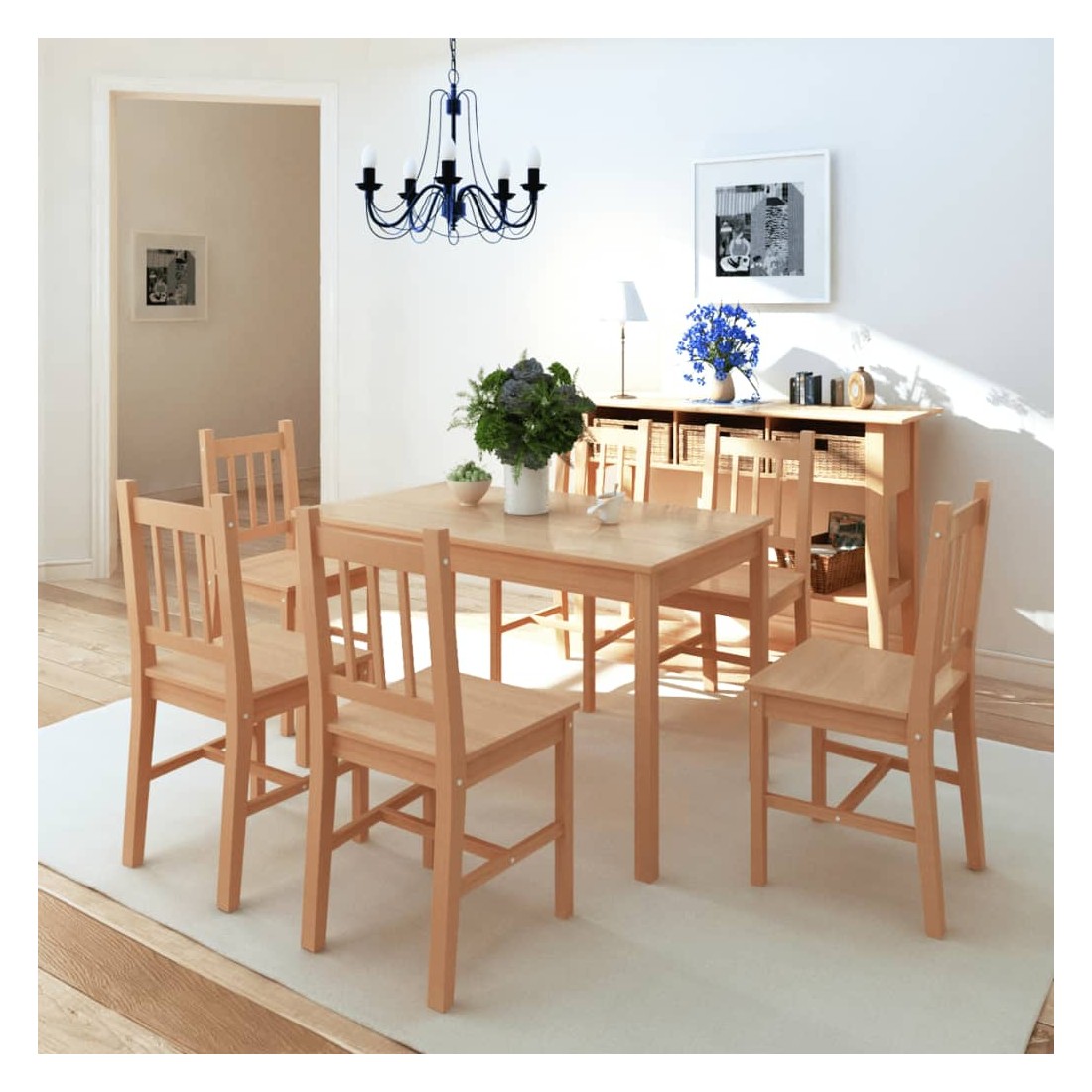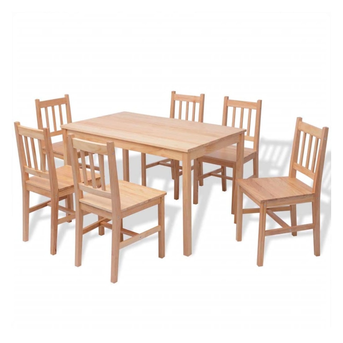 Cet ensemble de salle à manger, composé d'une table et de six chaises, a une conception simple mais élégante et ajoutera une touche de style à votre décor intérieur. Fabriquées en pinède de haute qualité, la table et les chaises de salle à manger sont très stables et durables. Cet ensemble de salle à manger est facile à nettoyer au moyen d'un chiffon humide. Facile à assembler. La livraison comprend 1 table et 6 chaises.