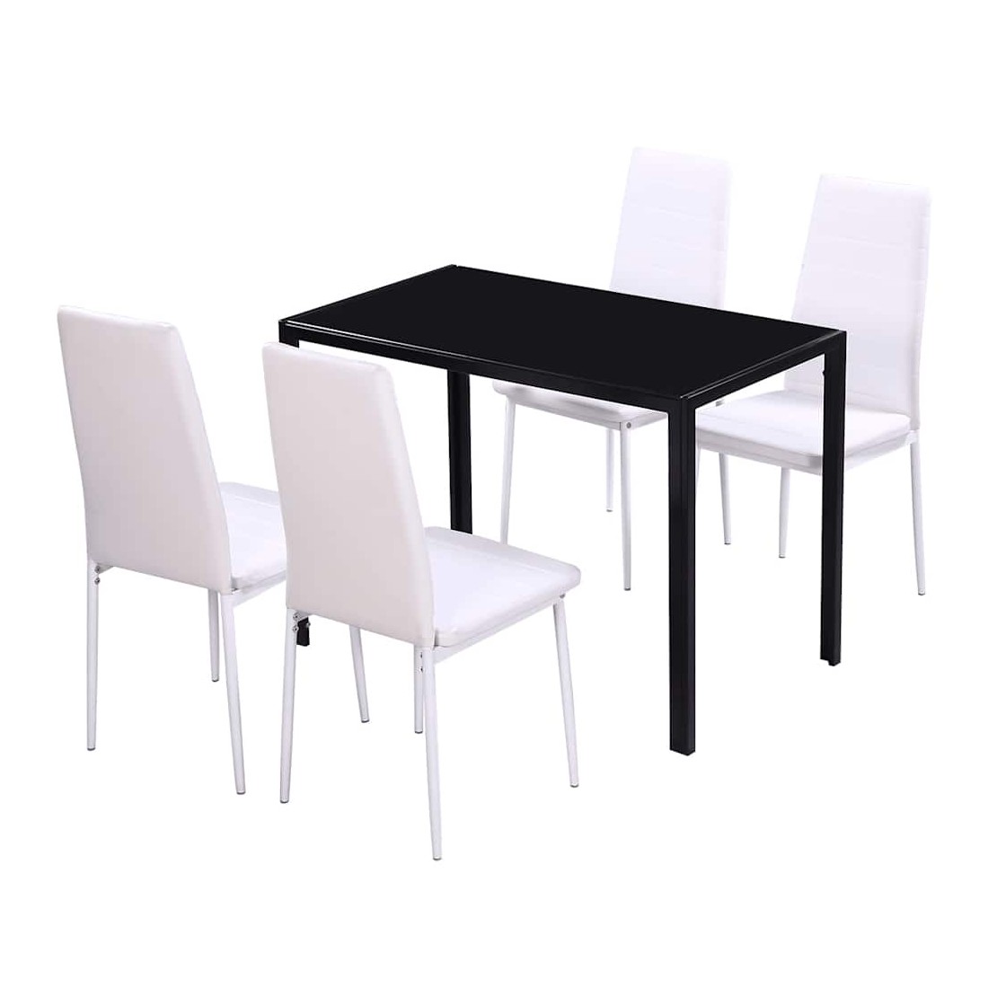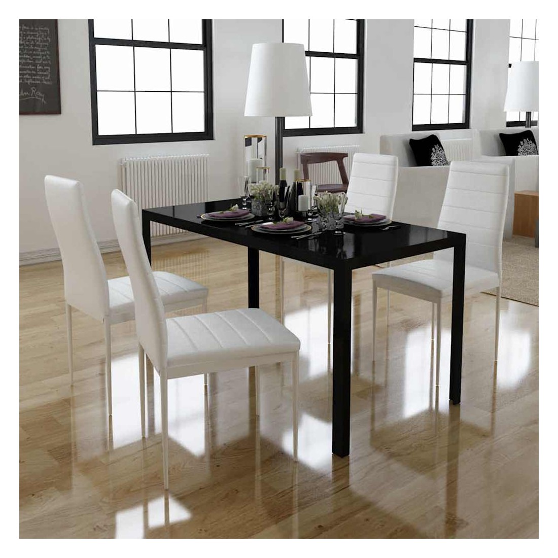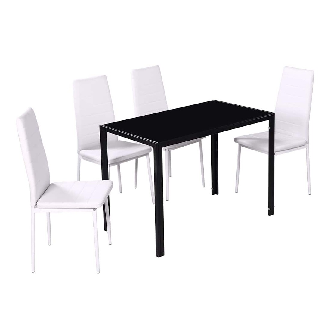 Cet ensemble de table à manger, composé de 5 pièces, a un design épuré et moderne et est parfait pour ceux qui cherchent à ajouter une touche de style à leur intérieur. Le dessus de table est en verre trempé très résistant et facile à nettoyer. Chaque chaise est recouverte de cuir artificiel de haute qualité. L'assise souple et rembourrée est très confortable. La livraison comprend 1 table et 4 chaises.