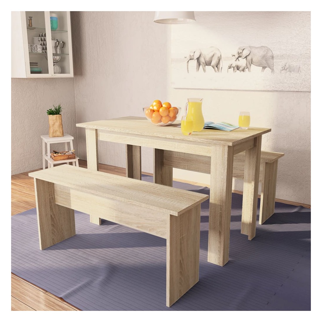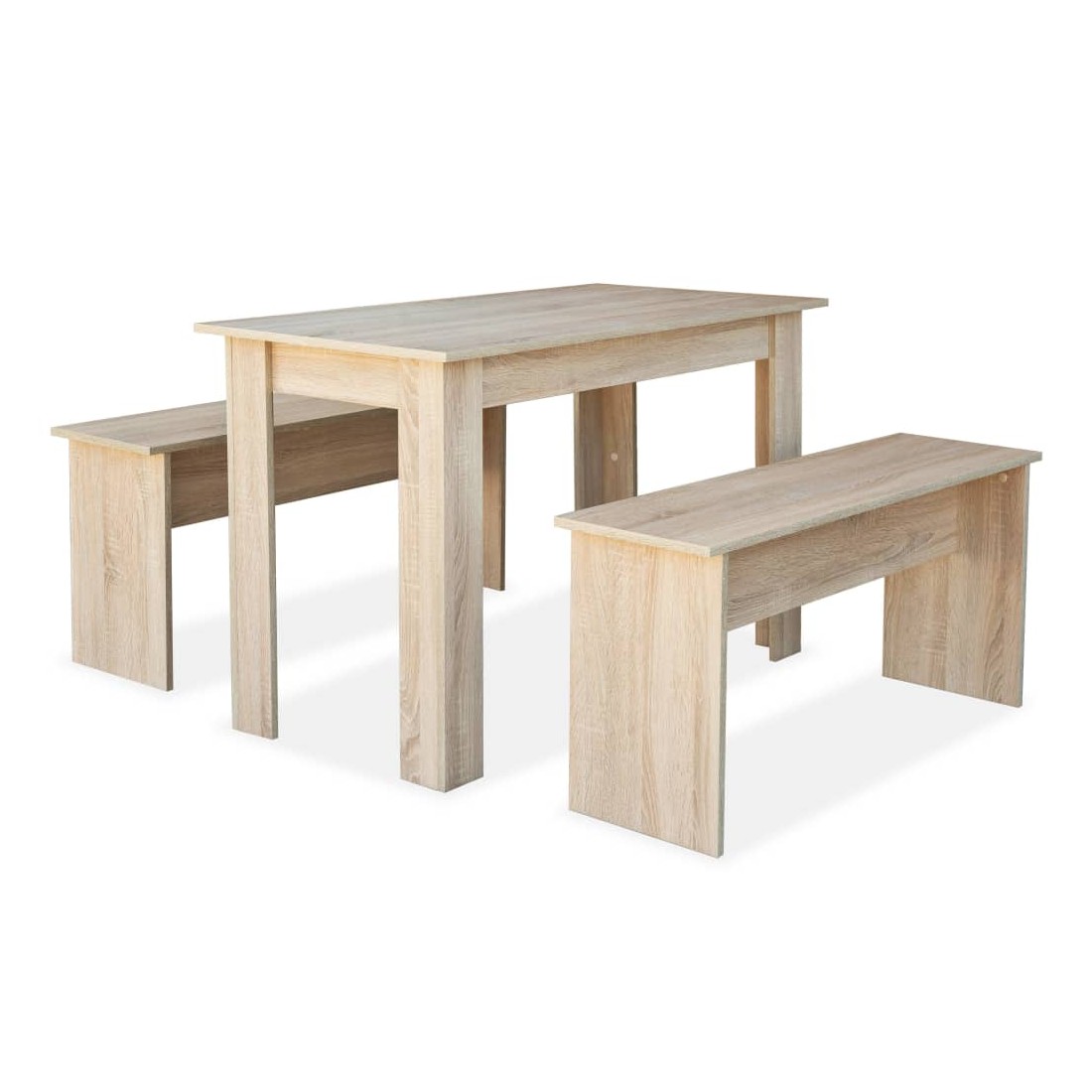 Cet ensemble de salle à manger a un design sobre et élégant qui conviendra à tous les décors. La table et les bancs sont en bois d’ingénierie avec des bords en PVC et sont stables et durables. L'ensemble est facile à nettoyer avec un chiffon humide. L'assemblage est facile, car un kit avec tous les accessoires d'assemblage nécessaires est inclus. La livraison comprend 1 table et 2 bancs.