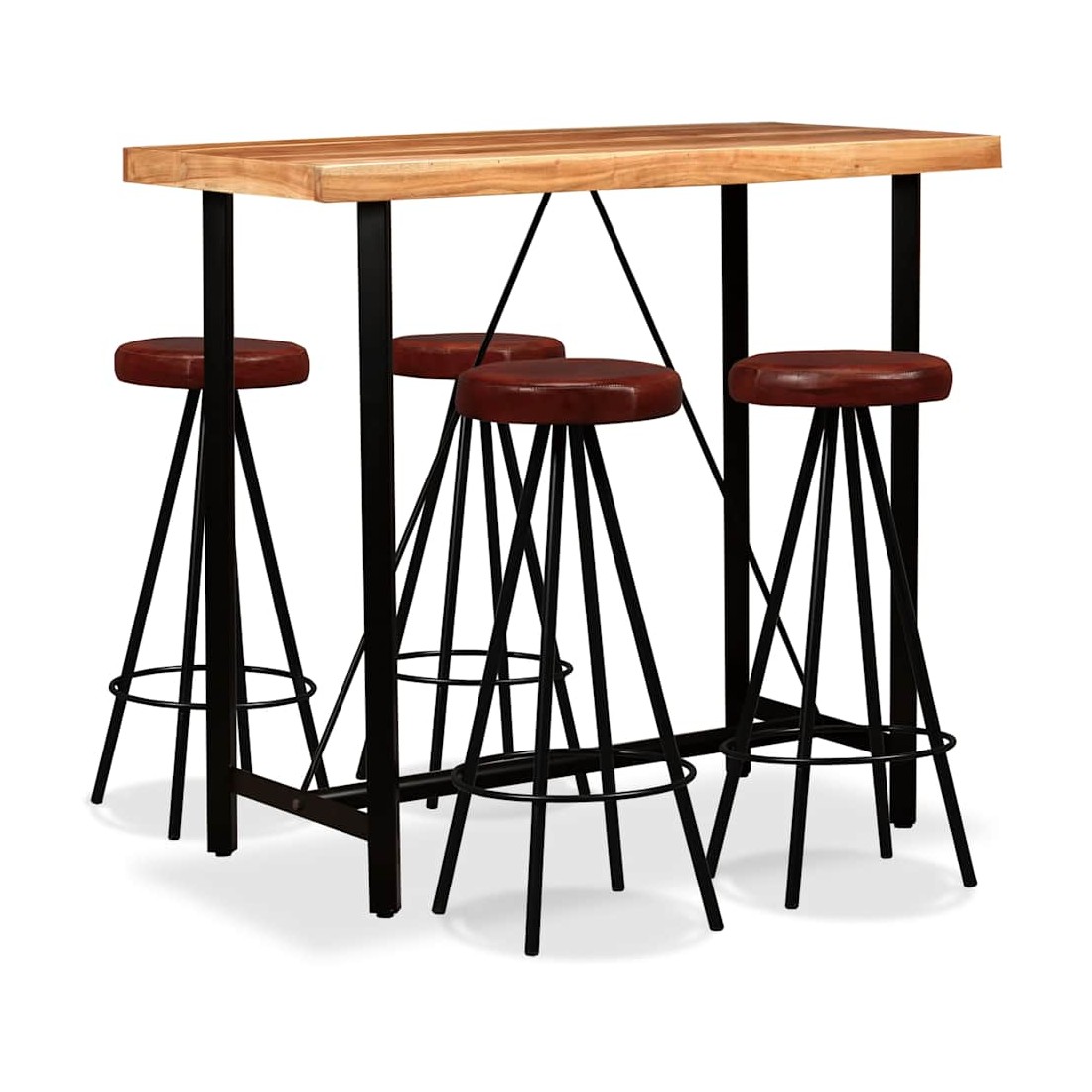 Cet ensemble de bar cool a un style industriel et sera un supplément distinctif à n'importe quelle maison, bar ou restaurant. La table de bar est en bois d'acacia massif qui est durable, stable et facile à nettoyer. Elle est entièrement faite à la main et les beaux grains de bois rendent chaque meuble unique et légèrement différent l'un de l'autre. Les pieds en acier fort rendent la table de bar très robuste et durable et ajoutent à son style industriel spectaculaire. Remarque importante : Les grains et les couleurs du bois peuvent varier d'une pièce à l'autre, ce qui rend chaque pièce unique; la livraison est aléatoire. Les tabourets de bar sont recouverts de cuir véritable doux au toucher, ce qui rend les tabourets extrêmement durables et confortables. Les pieds en acier font les tabourets très robustes et ajoutent à leur style industriel spectaculaire. La livraison comprend 1 table de bar et 4 tabourets de bar. L'assemblage est facile.