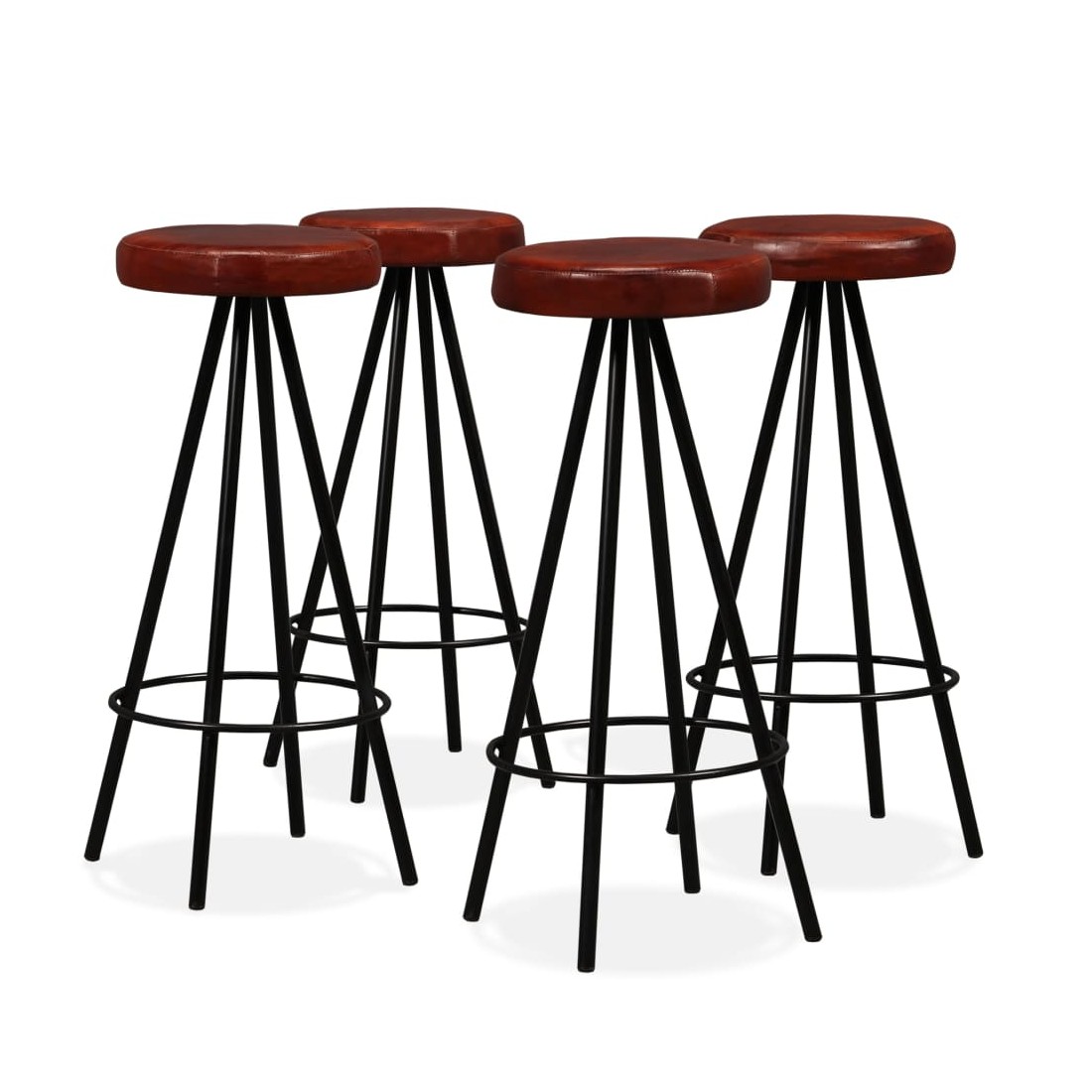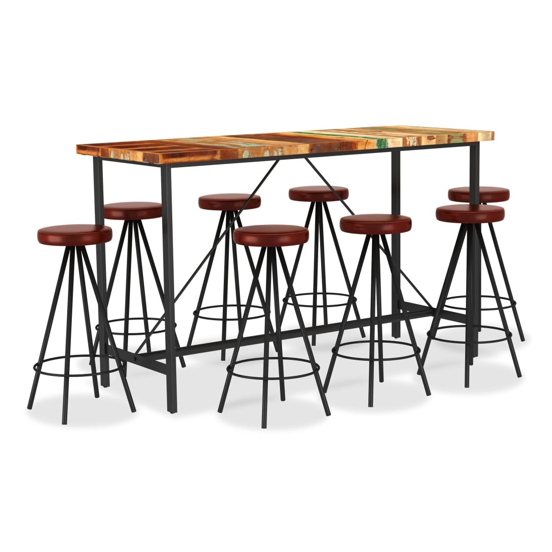 Cet ensemble de bar cool a un style industriel et sera un supplément distinctif à n'importe quelle maison, bar ou restaurant. La table de bar est faite de bois de récupération massif, ce qui signifie qu'elle a les caractéristiques de différents bois comme le teck, le bois de manguier, l'acacia, etc. Le bois de récupération est solide, stable, durable et beau. Des signes d'usure et d'artisanat donnent à chaque pièce un style unique. Il est entièrement fait à la main. Les pieds en acier robuste rendent la table de bar très robuste et durable et s'ajoutent à son style industriel spectaculaire. Remarque importante : Les grains et les couleurs du bois peuvent varier d'une pièce à l'autre, ce qui rend chaque pièce unique ; la livraison est aléatoire. Les tabourets de bar sont recouverts de cuir véritable doux au toucher, ce qui rend les tabourets extrêmement durables et confortables. Les pieds en acier font les tabourets très robustes et ajoutent à leur style industriel spectaculaire.
