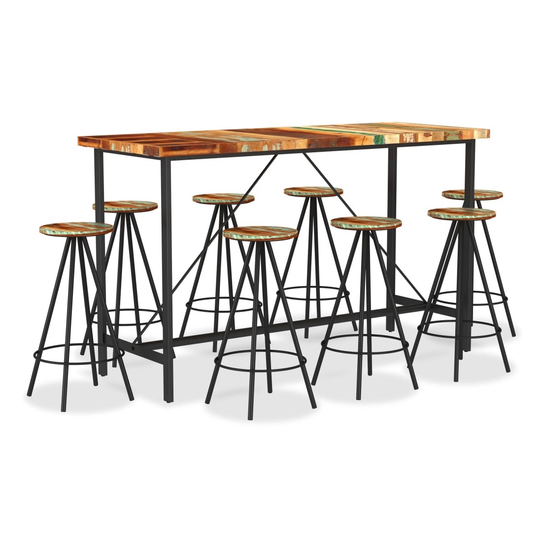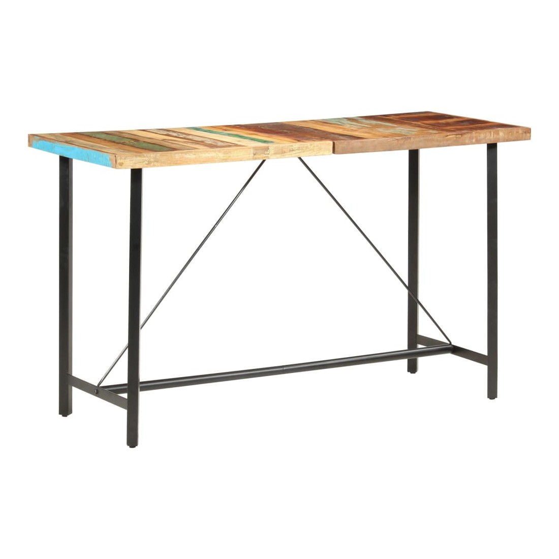 Cet ensemble de bar cool a un style industriel et sera un supplément distinctif à n'importe quelle maison, bar ou restaurant. La table de bar est fait de bois de récupération massif, ce qui signifie qu'il a les caractéristiques de différents bois comme le teck, le bois de manguier, l'acacia, etc. Le bois récupéré est solide, stable, durable et beau. Les signes d'usure donnent à chaque pièce un aspect unique et les pieds en acier s'ajoutent au style industriel spectaculaire. Chaque étape du processus de construction est réalisée avec le plus grand soin, que ce soit la recombinaison, le polissage, la peinture ou le laquage. Remarque importante : les couleurs et les grains de bois peuvent varier d'une pièce à l'autre, ce qui rend chaque pièce unique et légèrement différente l'une de l'autre ; la livraison est aléatoire.