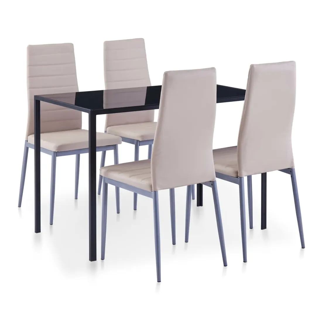 Cet ensemble de table à manger, composé de 5 pièces, a un design moderne et élégant et est parfait pour ceux qui cherchent à ajouter une touche de style à leur intérieur. Le dessus de table est en verre trempé à haute résistance, facile à nettoyer. Chaque chaise est recouverte de similicuir de qualité. Le siège souple et rembourré est très confortable. La livraison comprend 1 table et 4 chaises.