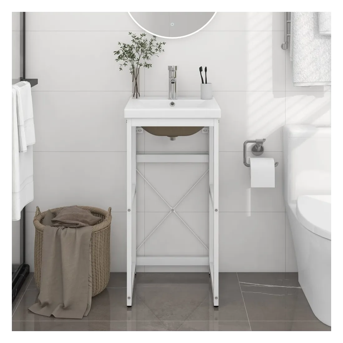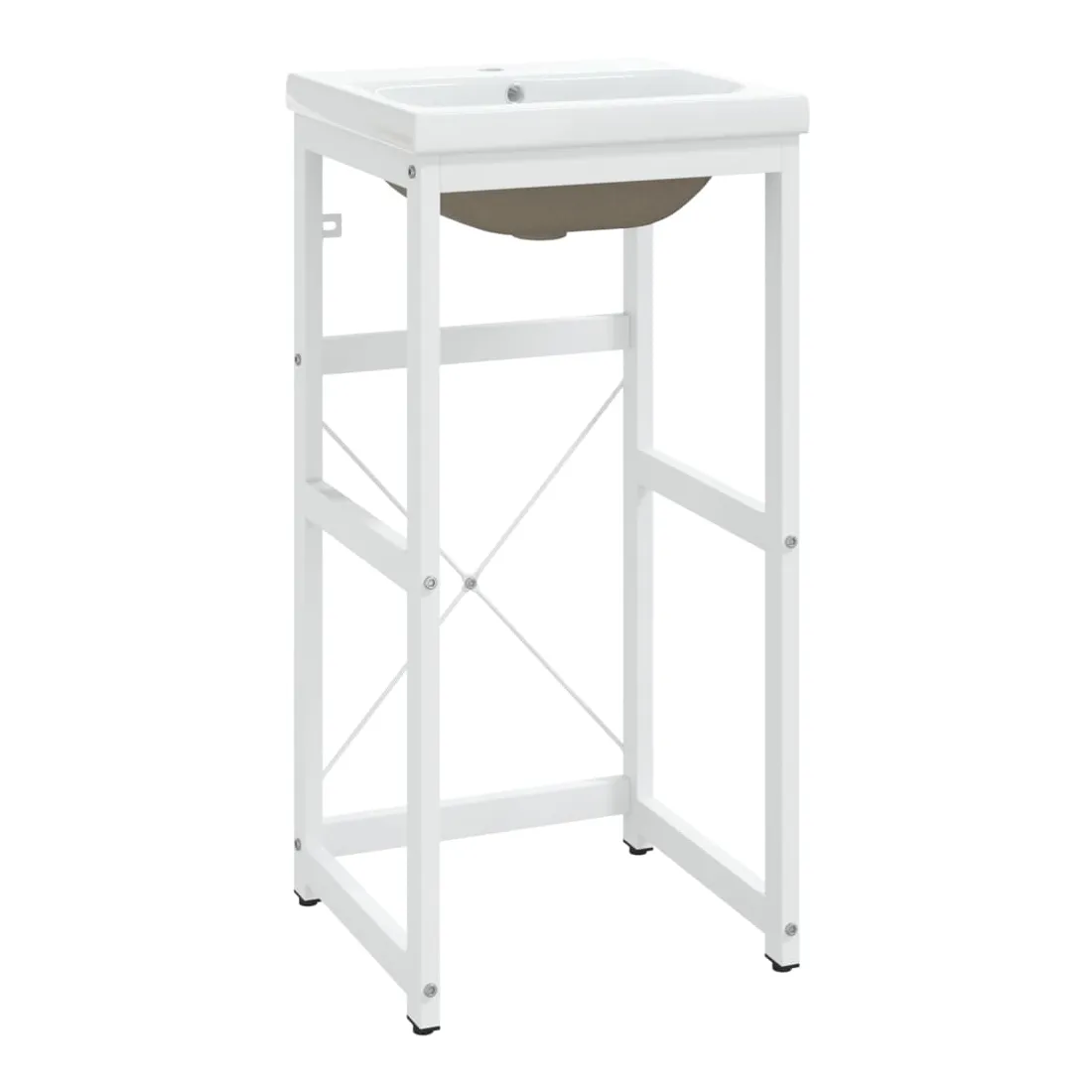 Ce cadre de lavabo de salle de bain avec une vasque à encastrer s'intègre parfaitement à votre salle de bain ou à votre salle d'eau, avec un aspect propre et ordonné. Le support de lavage est fabriqué en fer enduit de poudre, ce qui le rend stable et durable. Ce cadre de lavabo permet d'accéder facilement aux serviettes et aux paniers et crée un espace plus vaste qu'un rangement fermé. Fabriqué en céramique, le bassin peut non seulement servir de récipient pour un usage quotidien mais aussi d'ornement dans votre espace de vie. Grâce à son design tendance et contemporain, ce lavabo s'adaptera à tout décor. Un trop-plein est également prévu pour vidanger l'eau lorsque le lavabo est trop plein. Sa surface émaillée lui confère un design moderne et élégant. De plus, le cadre de lavabo et la vasque sont faciles à nettoyer avec un chiffon humide. Remarque : le robinet et le vidange ne sont pas inclus dans la livraison.