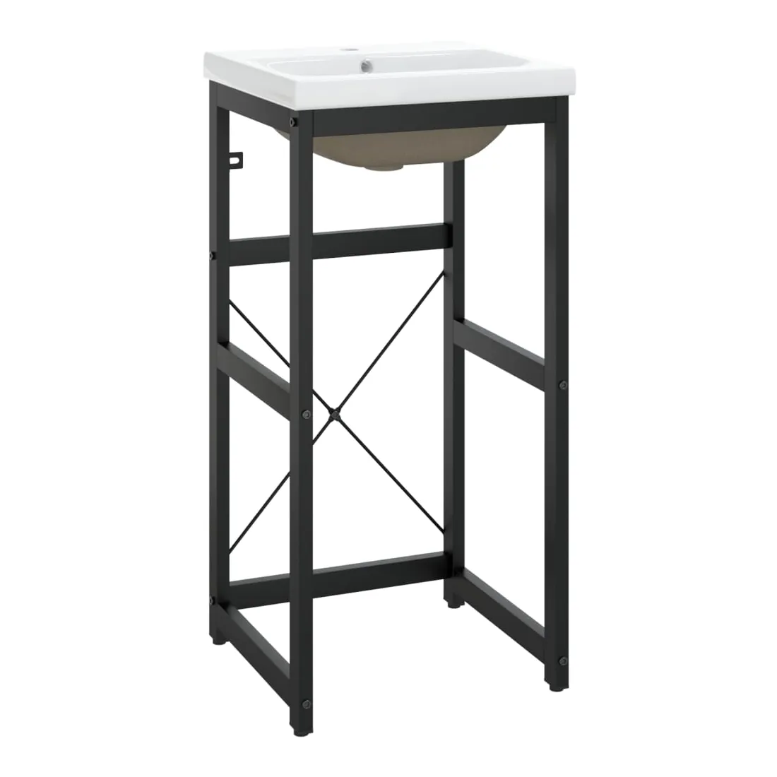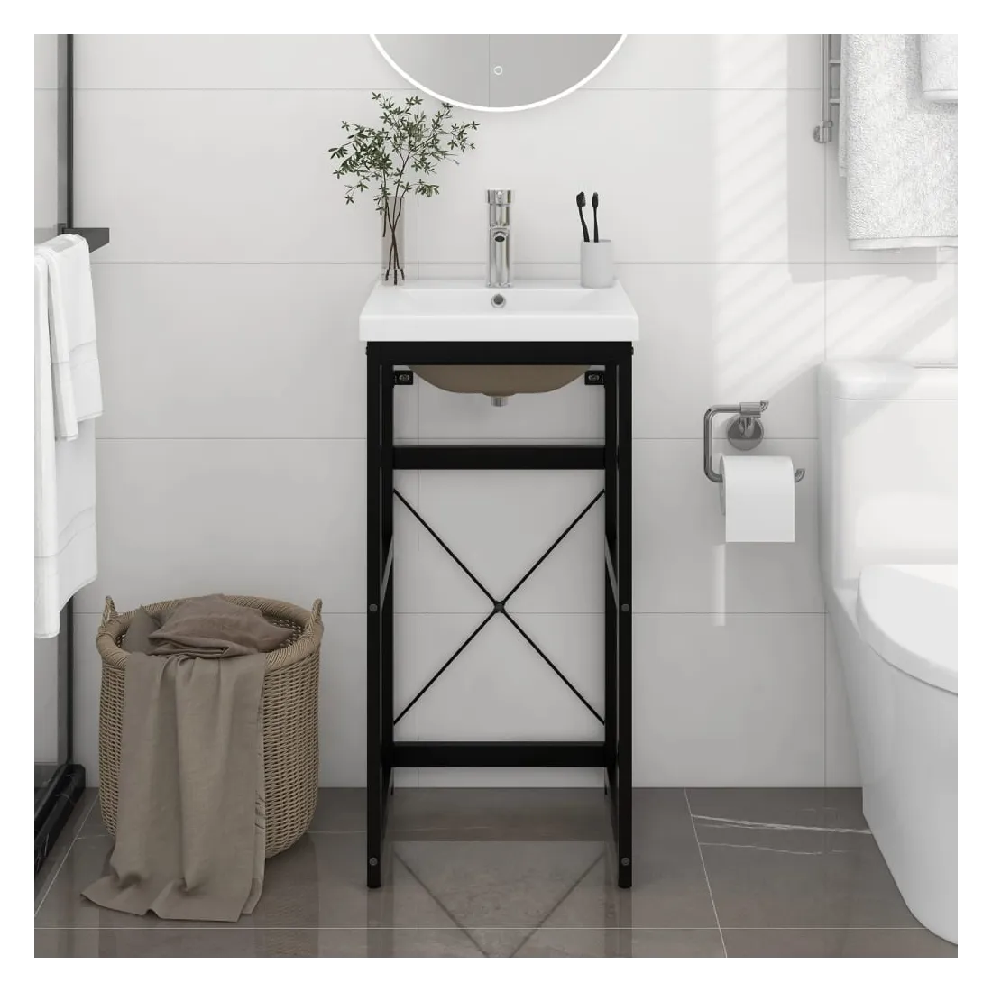 Ce cadre de lavabo de salle de bain avec une vasque à encastrer s'intègre parfaitement à votre salle de bain ou à votre salle d'eau, avec un aspect propre et ordonné. Le support de lavage est fabriqué en fer enduit de poudre, ce qui le rend stable et durable. Ce cadre de lavabo permet d'accéder facilement aux serviettes et aux paniers et crée un espace plus vaste qu'un rangement fermé. Fabriqué en céramique, le bassin peut non seulement servir de récipient pour un usage quotidien mais aussi d'ornement dans votre espace de vie. Grâce à son design tendance et contemporain, ce lavabo s'adaptera à tout décor. Un trop-plein est également prévu pour vidanger l'eau lorsque le lavabo est trop plein. Sa surface émaillée lui confère un design moderne et élégant. De plus, le cadre de lavabo et la vasque sont faciles à nettoyer avec un chiffon humide. Remarque : le robinet et le vidange ne sont pas inclus dans la livraison.