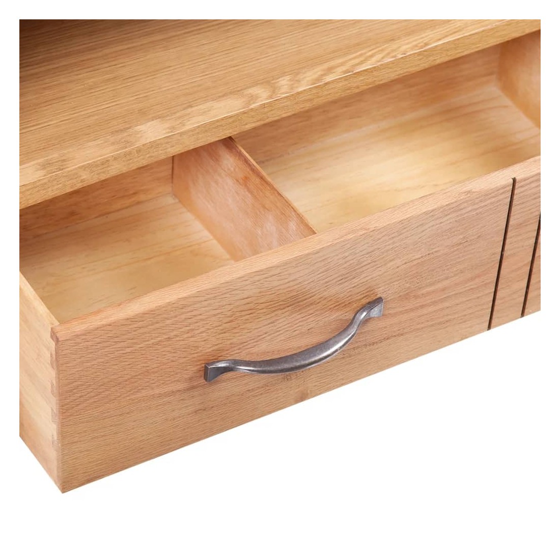 Ce meuble TV en bois de haute qualité a une apparence rustique qui conviendra à toute chambre à coucher ou salon. Ce meuble TV est fabriqué de façon experte en chêne solide durable et hautement fonctionnel. Il comporte un tiroir avec deux compartiments pour les bibelots et une étagère pour les lecteurs multimédia ou les consoles de jeu et les systèmes de son surround. Une sortie pratique pour câbles vous permet de les garder soigneusement hors de la vue.