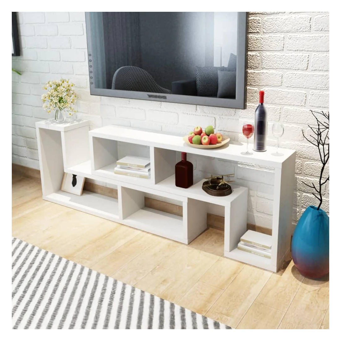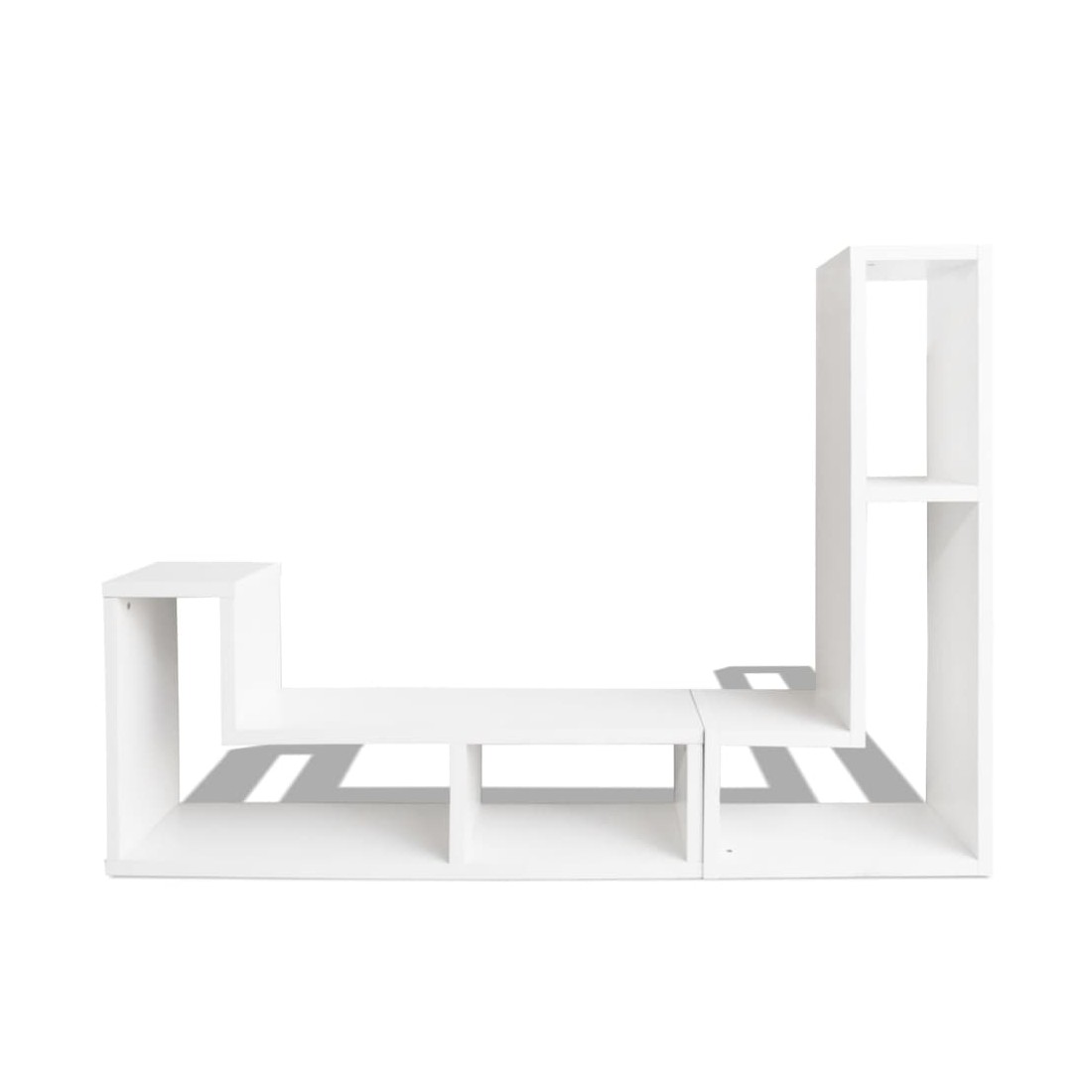 Ce meuble TV au design moderne et multifonctionnel sera un excellent ajout à n'importe quelle maison. Sa construction robuste rend ce meuble TV extrêmement durable. Le support TV est fait en deux étagères en forme de L, qui peuvent être placées de plusieurs façons. Les grandes étagères avec beaucoup d'espace vous permet de ranger soigneusement vos lecteurs DVD, consoles de jeu, appareil de diffusion en continu, appareils de stockage, objets décoratifs, etc. Soyez créatif et choisissez la meilleur configuration pour ce meuble élégant et fonctionnel !