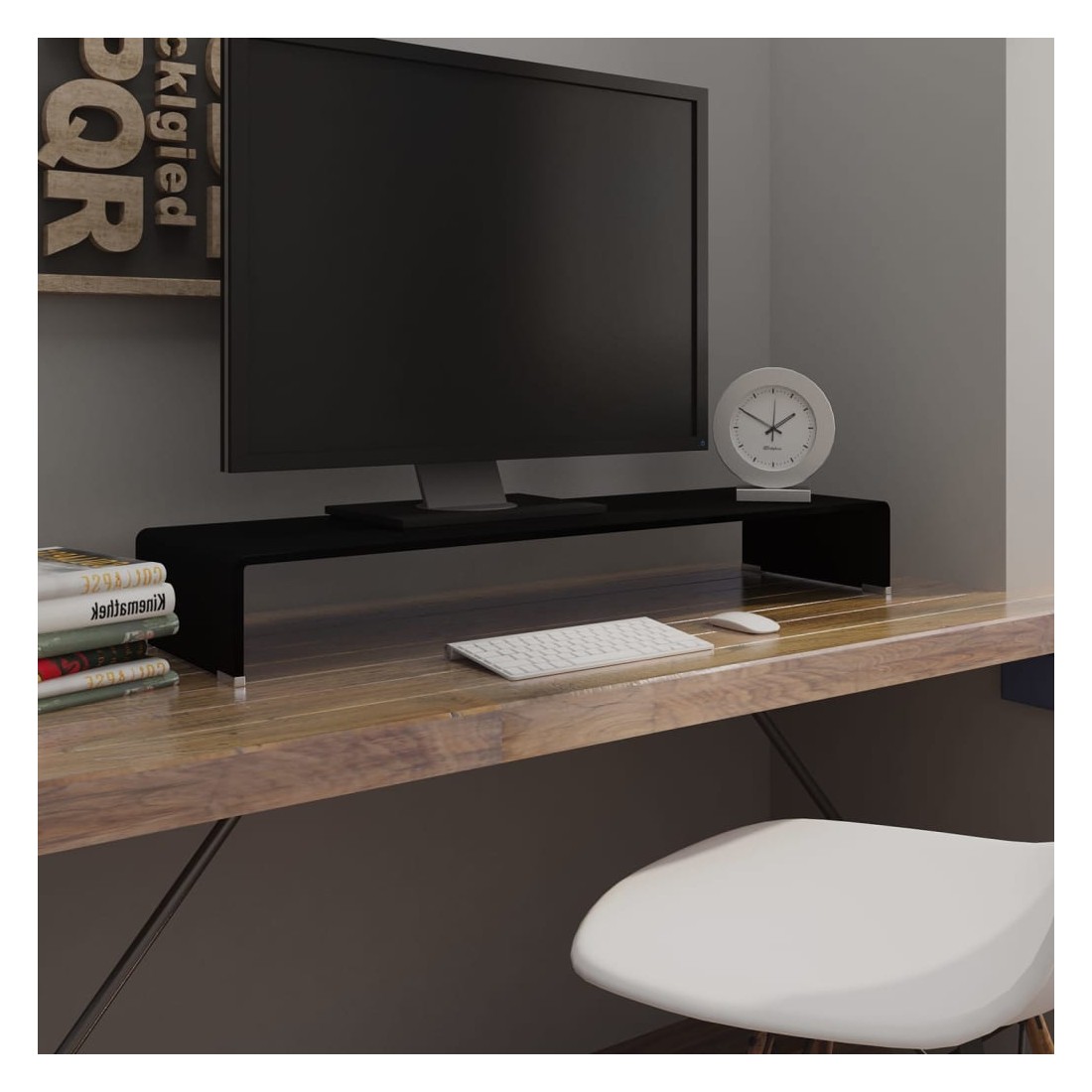 Ce support TV pratique est doté d'une construction en verre trempé. Le design élégant et profilé de ce meuble TV raffiné ajoutera une touche moderne à votre espace de vie. Cette étagère en verre peut être utilisée comme support TV ou support pour votre moniteur d'ordinateur, téléviseur, ordinateur portable et autres appareils multimédia. Avec une étagère en verre qui soulève le moniteur, vous aurez une meilleure vision de l'écran en étant confortablement assis, ce qui permet à réduire la tension et l'inconfort sur votre cou ou dos. L'espace en dessous peut accueillir votre lecteur de DVD, console de jeux, appareil de diffusion en continu, récepteurs et des supports média. Le cadre en verre est trempé pour ajouter de la résistance et de la sécurité. La surface lisse est facile à nettoyer avec seulement un chiffon humide.