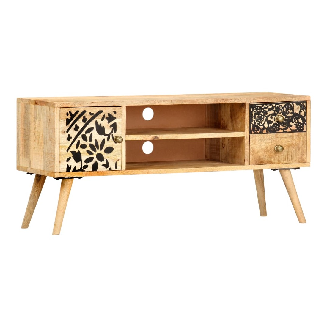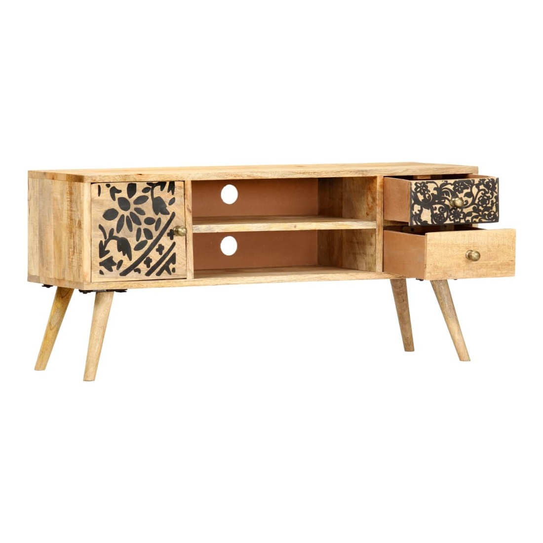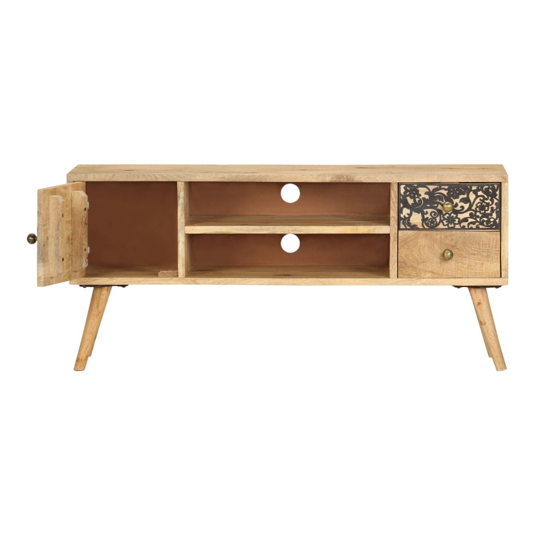 Ce meuble TV de style industriel deviendra le point de mire de votre salon ou de votre espace de divertissement. Il peut également être utilisé comme buffet, bahut, etc. Le meuble TV est en bois de manguier massif, stable, durable et beau, et la qualité de fabrication rehausse son spectaculaire style rétro. Chaque étape du processus est réalisée avec le plus grand soin, que ce soit le polissage, la peinture ou le laquage. Le savoir-faire artisanal et les belles veines de bois rendent chaque meuble unique et légèrement différent l'un de l'autre. Les 2 compartiments ouverts, 2 tiroirs et une porte offrent suffisamment d'espace pour ranger les lecteurs DVD, les consoles de jeux, les appareils de retransmission en continu et les supports multimédia de façon ordonnée. Remarque importante :